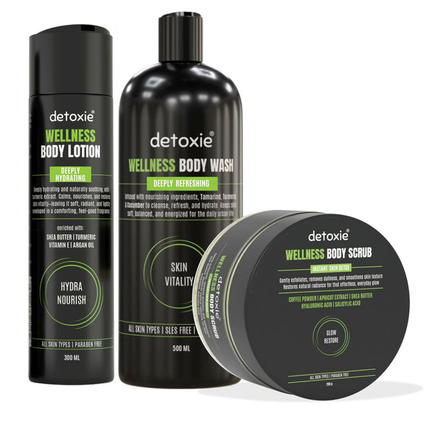 The Detoxie Wellness Body Care Combo is a three-step set designed for a simple shower and skincare routine. It features a Body Wash, a Body Scrub, and a Body Lotion, each created to be part of an everyday self-care ritual.