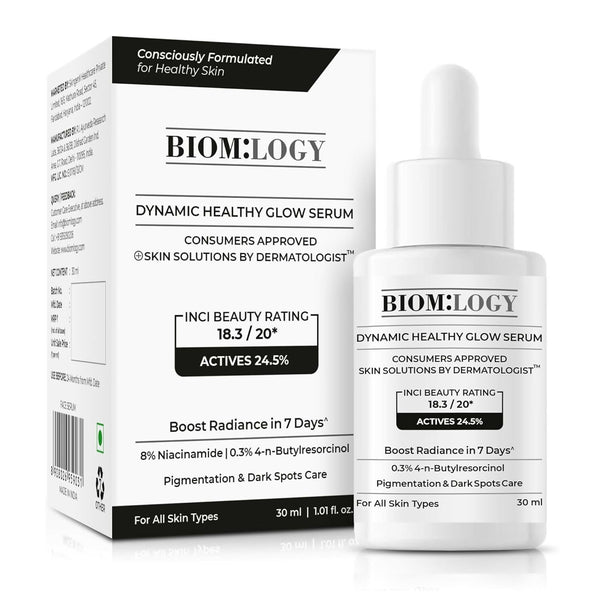 Biomlogy Dynamic Healthy Glow Face Serum is a multi-active skincare formulation designed with a blend of scientifically recognized ingredients and soothing botanicals. Rated 18.6/20 by INCI Beauty, it combines papain enzymes, prebiotic ferments, vitamin D3, niacinamide, 4-n-Butylresorcinol, ceramides, hyaluronic acid, peptides, and natural bases such as bamboo water, aloe vera, and chamomile.