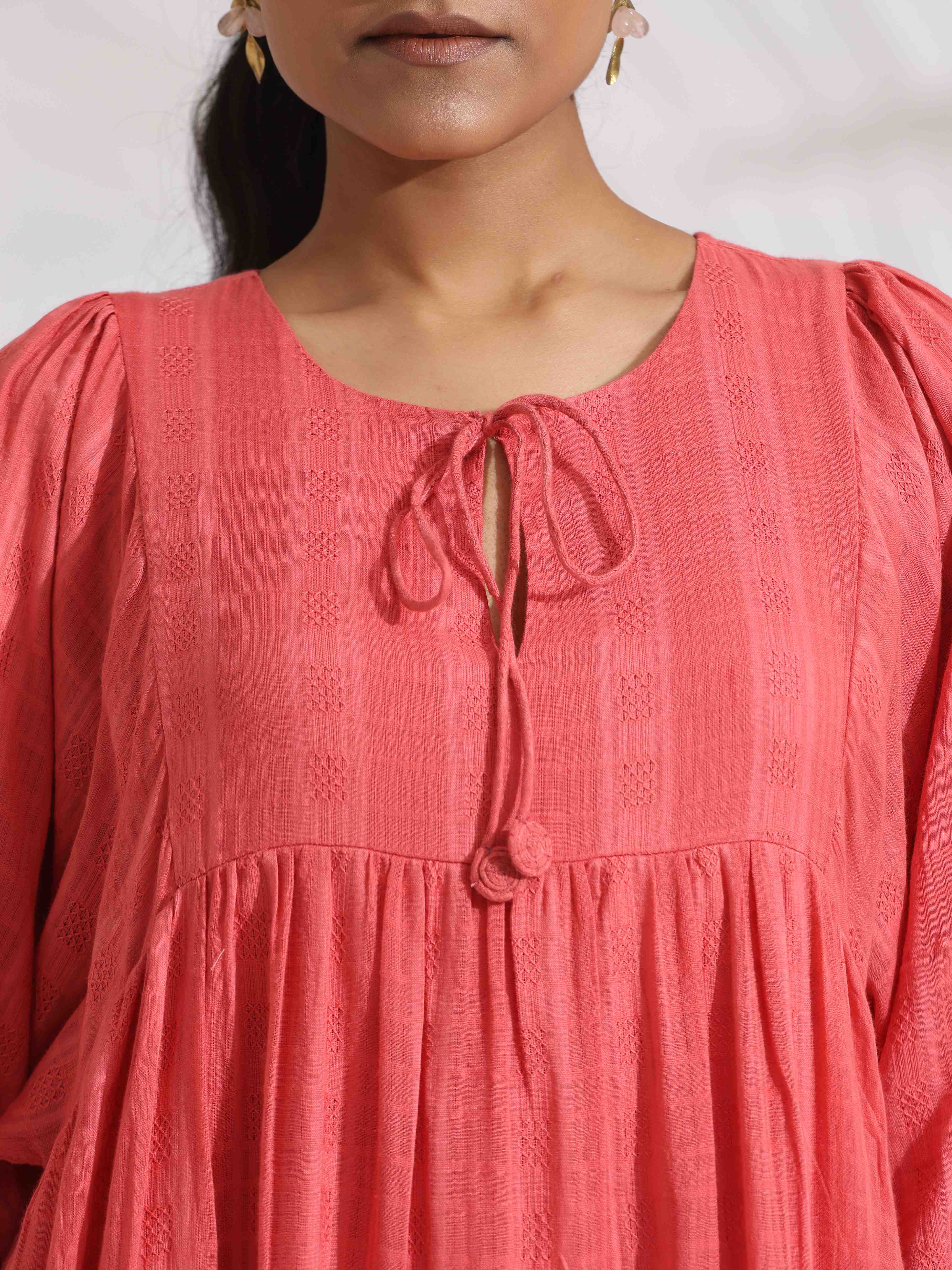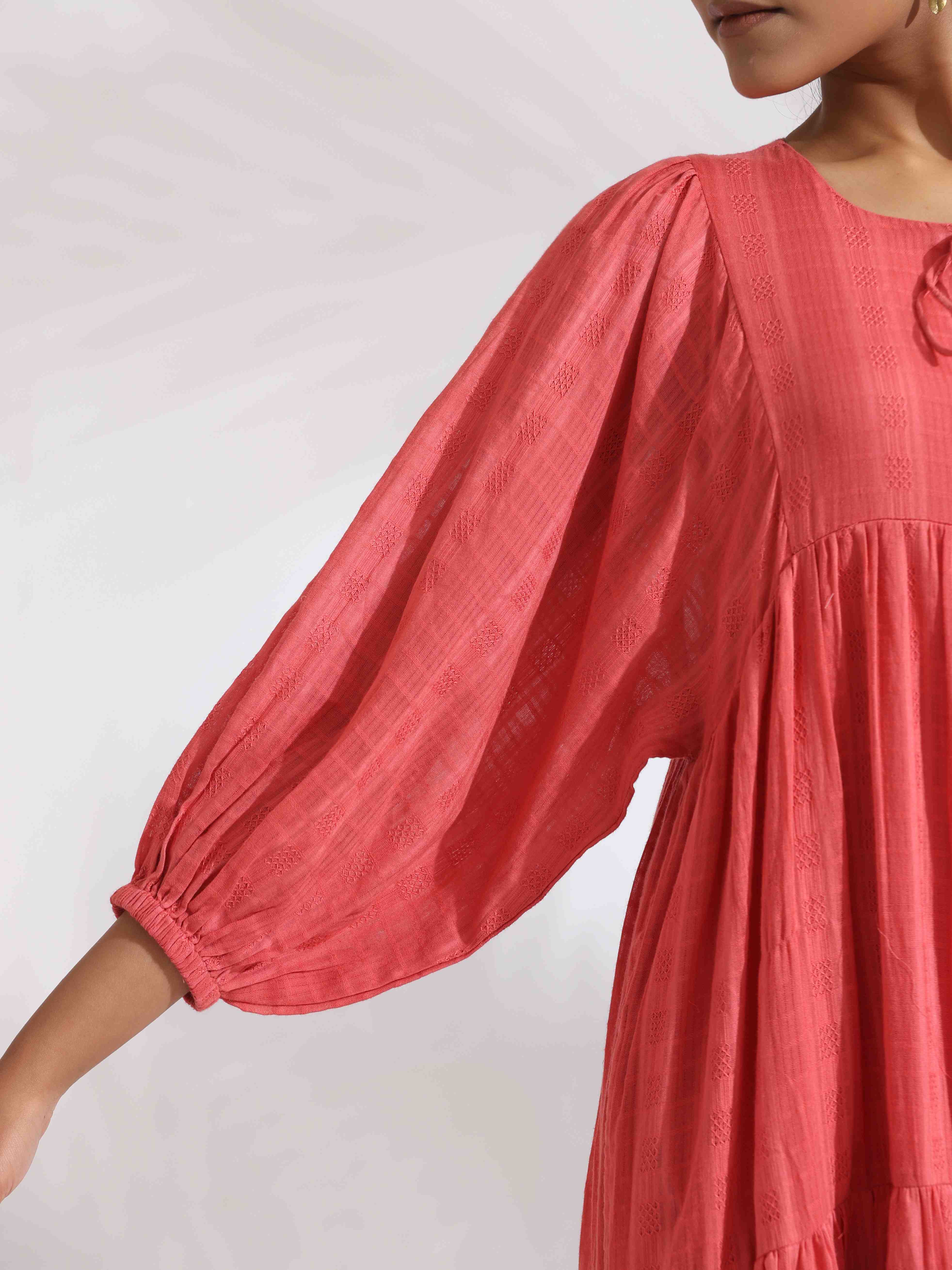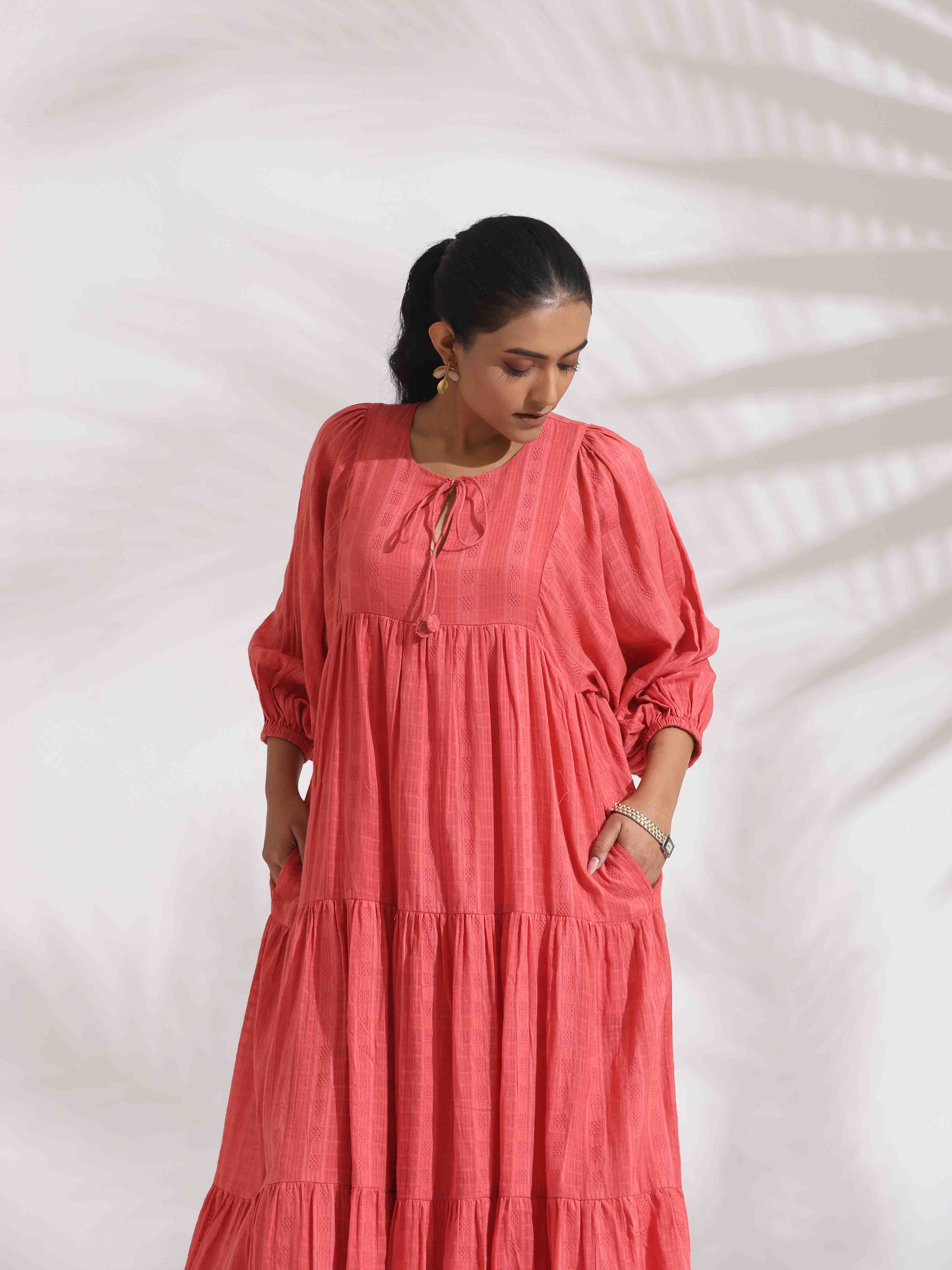 • Elevate your style with this pink cotton multi-tier dress, featuring kimono sleeves with elasticated opening.