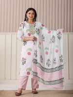 Yufta White Floral Print Cotton Show Button On Yoke Plus Size Kurta Set With Pant & Dupatta