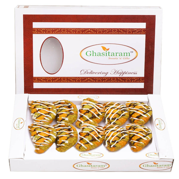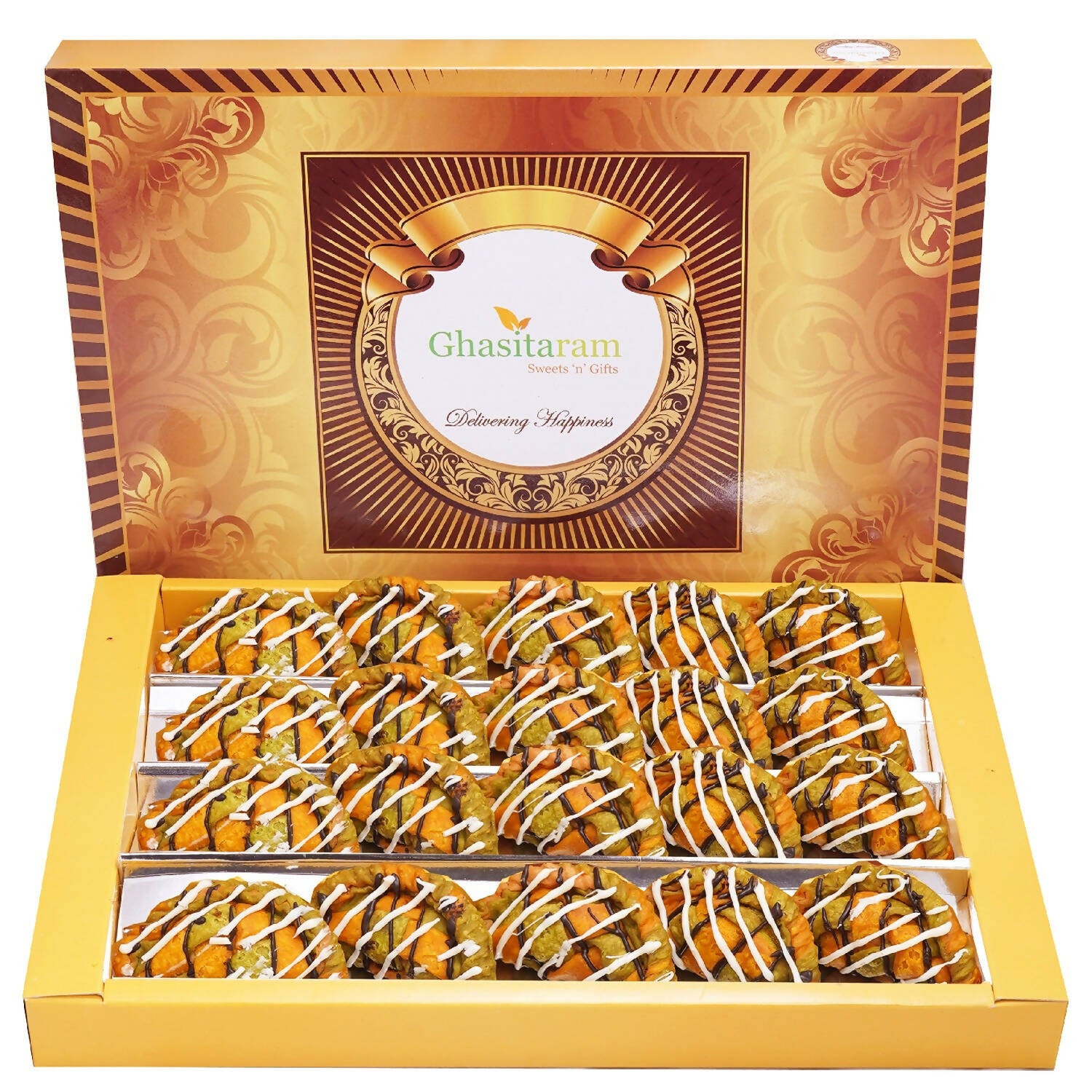 Ghasitaram Designer GujiyaA beautiful box containing these designer Gujiya Sweets which is a refined flour pastry stuffed with dryfruits cardamom a...