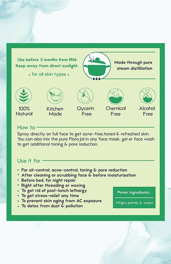 • Fresh steam distilled from Mogra flowers to maximise its properties of toning and repair of damaged skin, wrinkles and pores.
