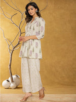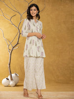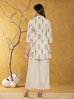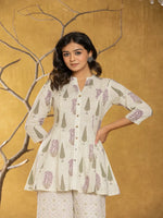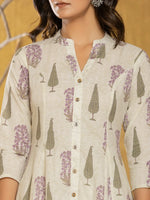 Cream-coloured ethnic motifs printed tunic, has a notched band collar, three-quarter sleeves and flared hem
