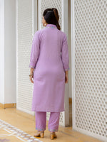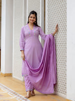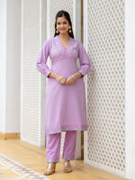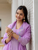 Kalini Floral Embroidered V-Neck Thread Work Pure Cotton Kurta With Trousers & Dupatta Product Details Lavender embroidered Kurta with Trous...