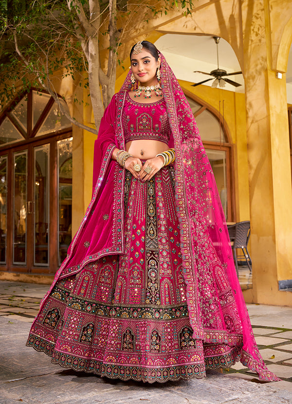 Monjolika Fashion Rani Pink Heavy Zarkan Diamond & Mirror Hand Embroidery Velvet Bridal Lehenga Choli With Double DupattaProduct Details:Sensib...