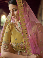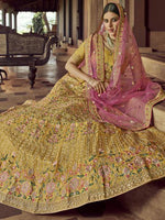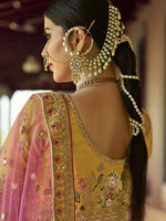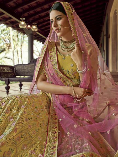 Mustard Heavy Embroidered Georgette bridal Lehenga features a Georgette with satin 2 layer with heavy quality can-can lehenga . embroidery is completed with Resham & Zari. This Style is made in India and checked by hand to ensure high quality.