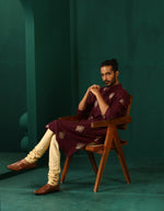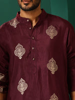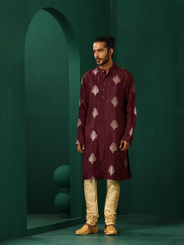 trueBrowns Men's Wine Geometric Viscose Silk Long Kurta