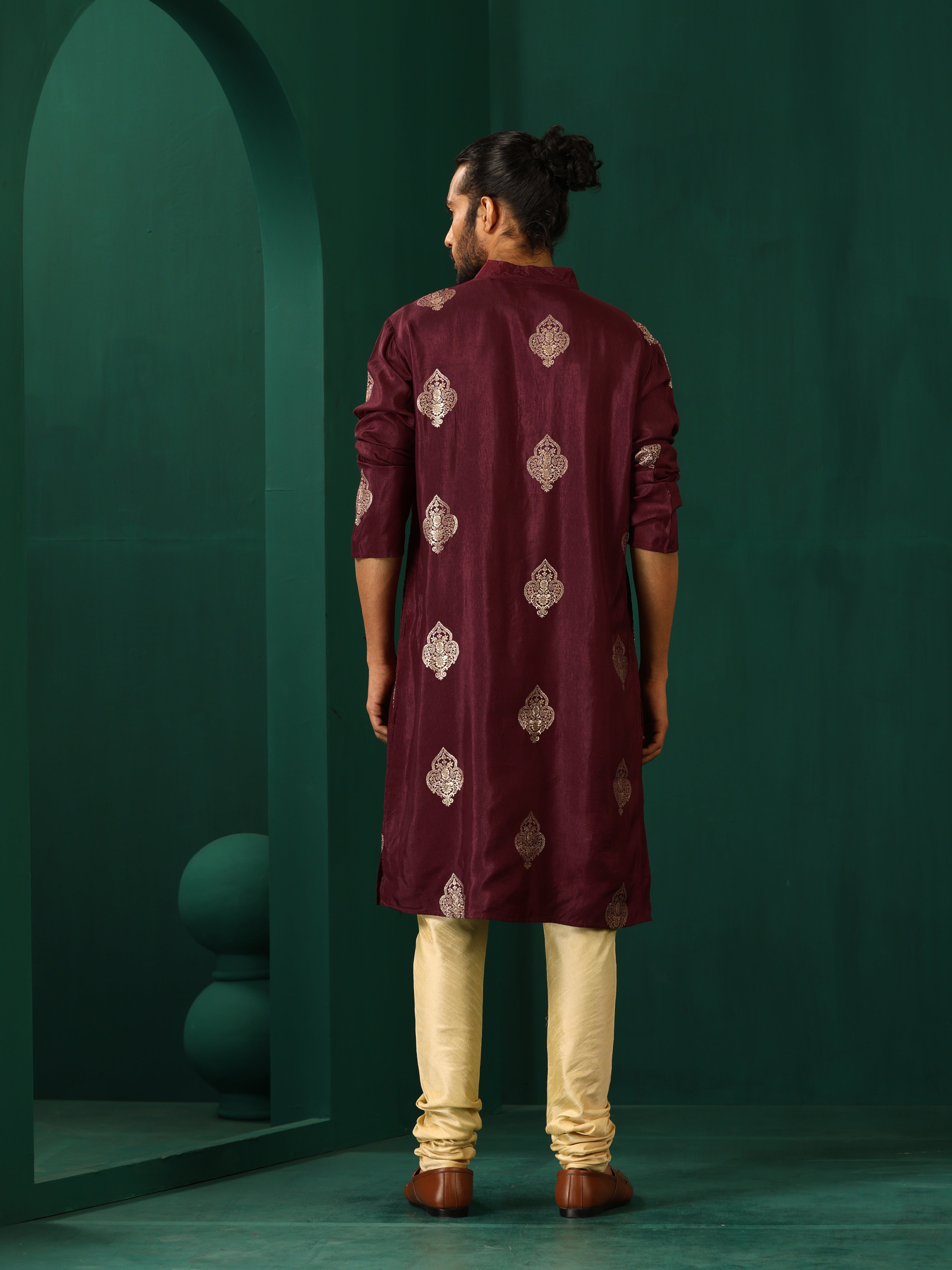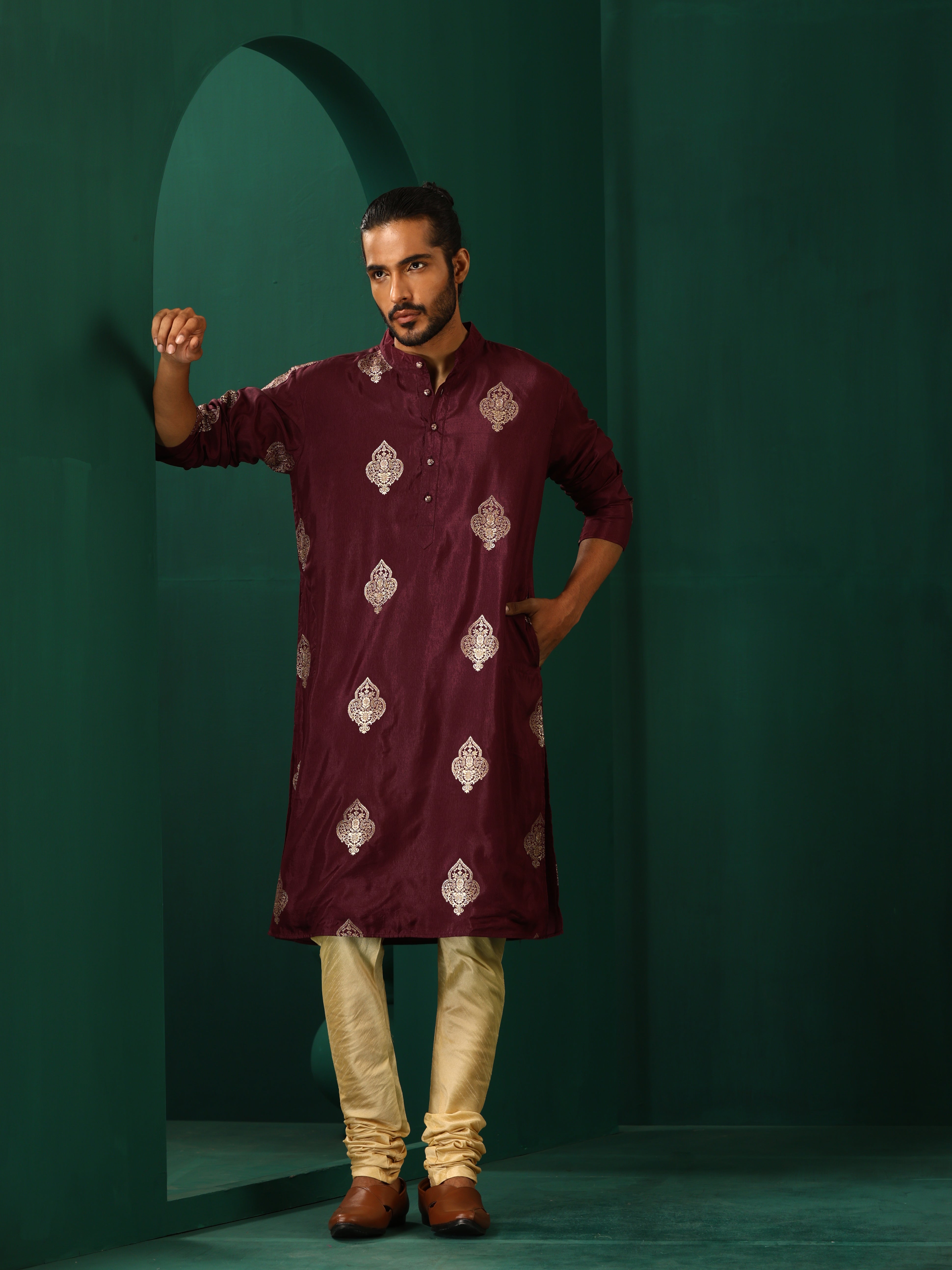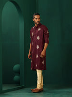 trueBrowns Men's Wine Geometric Viscose Silk Long KurtaDescription Viscose Silk Long Kurta in regular fit with full sleeves. It has zari embroidere...