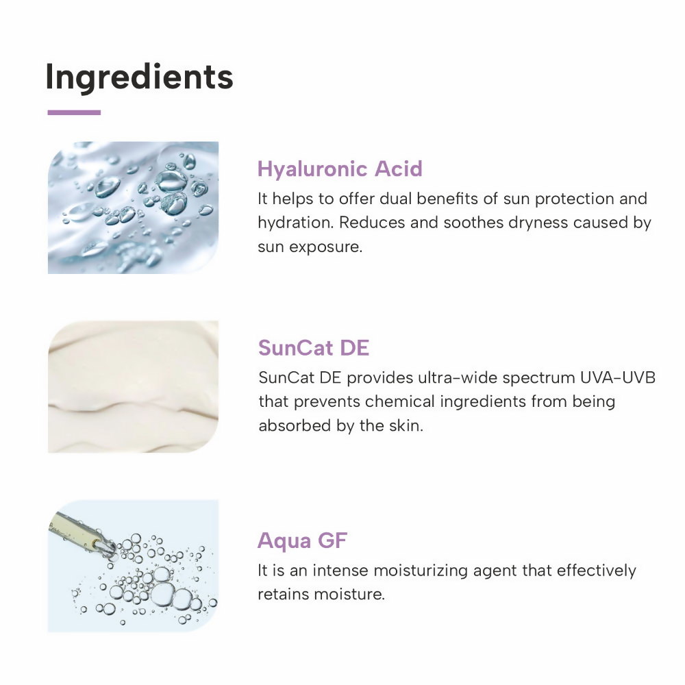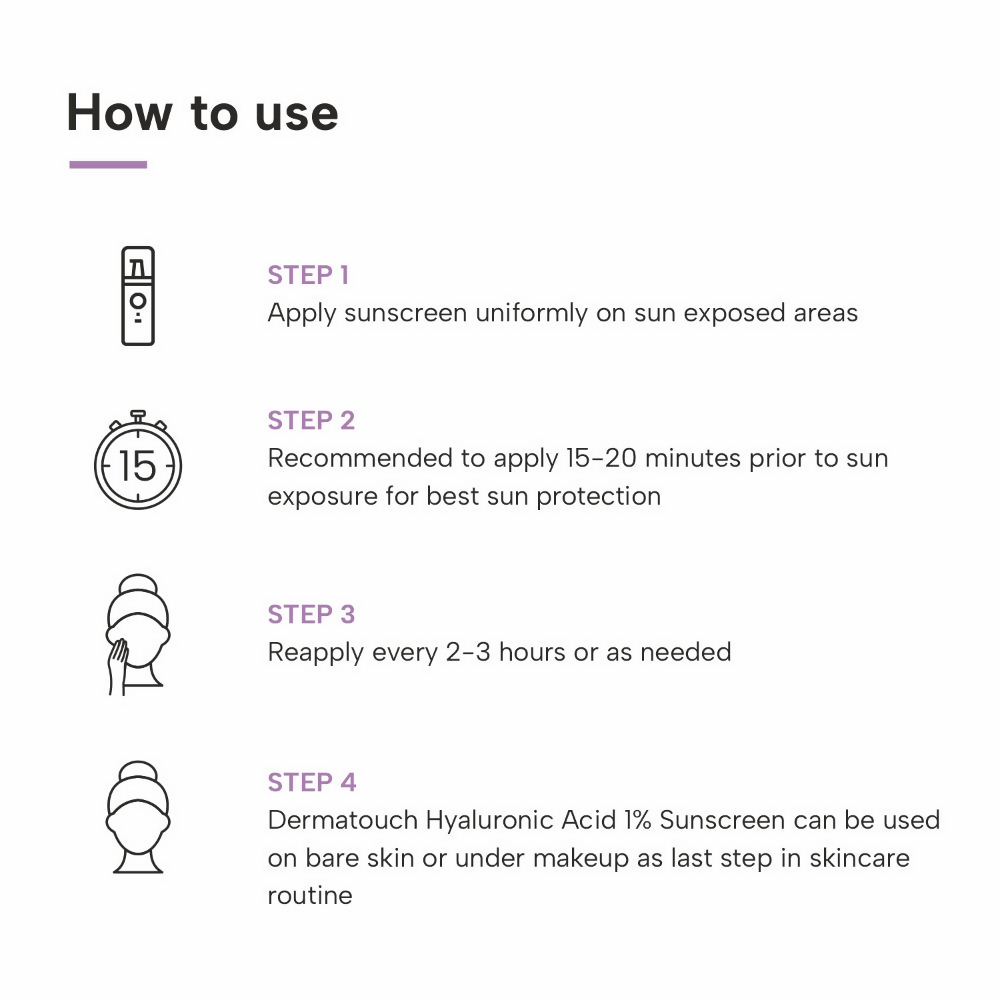 • Non-greasy & lightweight: Dermatouch HA 1% Sunscreen is a non-oily & cream-based formula that is very lightweight in application on the skin.