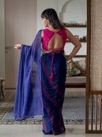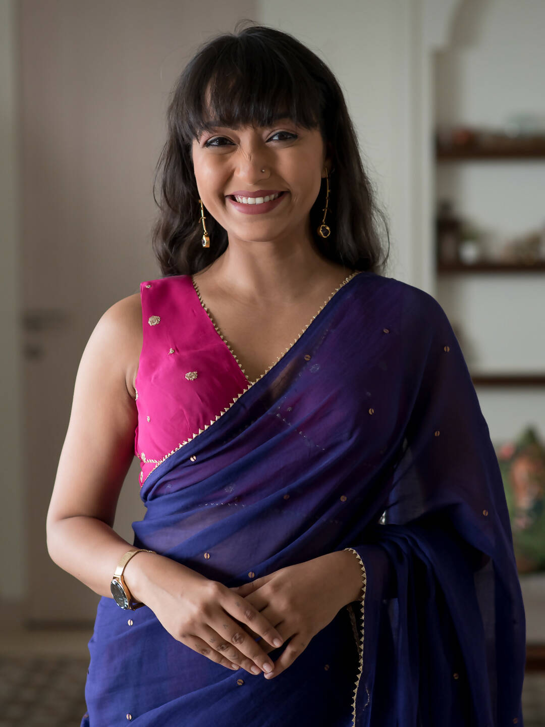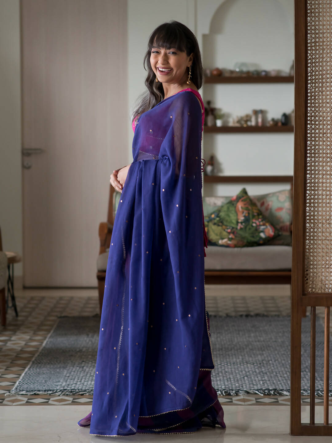 This charming Purple color saree's drape is 5.5 meters long. The Saree does not come with a readymade blouse as donned by the model in the picture; But can be purchased separately from Suta.