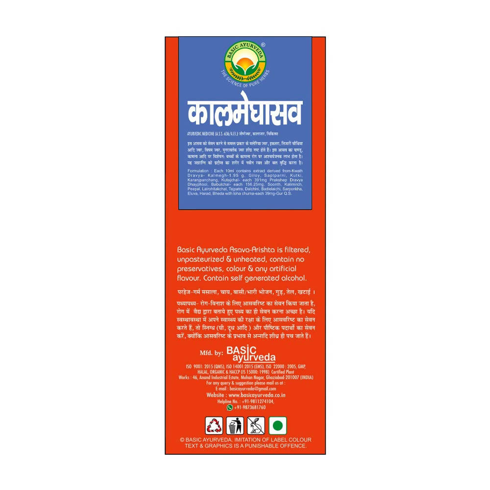 • Basic Ayurveda Kalmeghasav is a liquid Ayurvedic tonic which is a combination of Kalmegh, Guduchi, Saptparni, Kutki, Karang panchang, Kutaj chhal, Dhay Phool , Ginger, Kali mirch, Pippali, lal Rohitak chhal, Tej Patta, Dalchini, Badi Ellaichi, Sarpankha, Eluva, Haritaki, Loh churana, Baheda with other herbs. It is used in the problems of Liver problems, Anti-inflammatory, Antibacterial, Digestive problems, etc.
