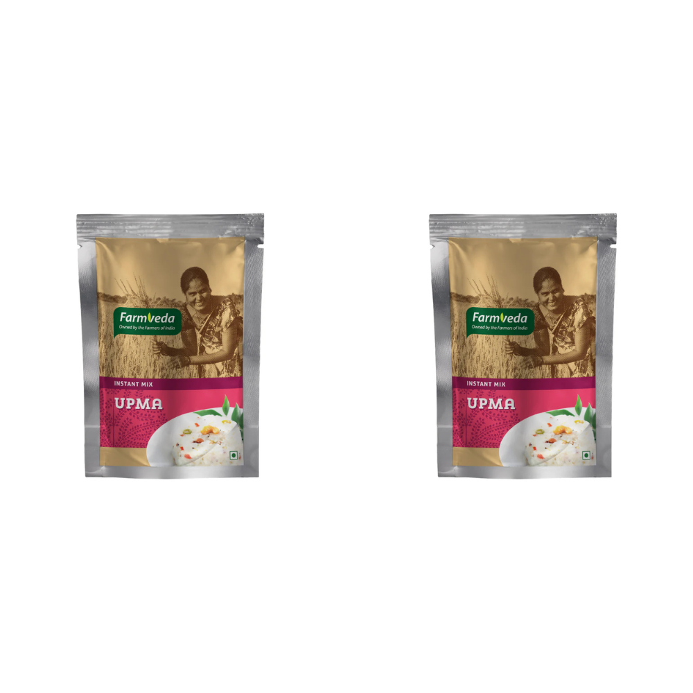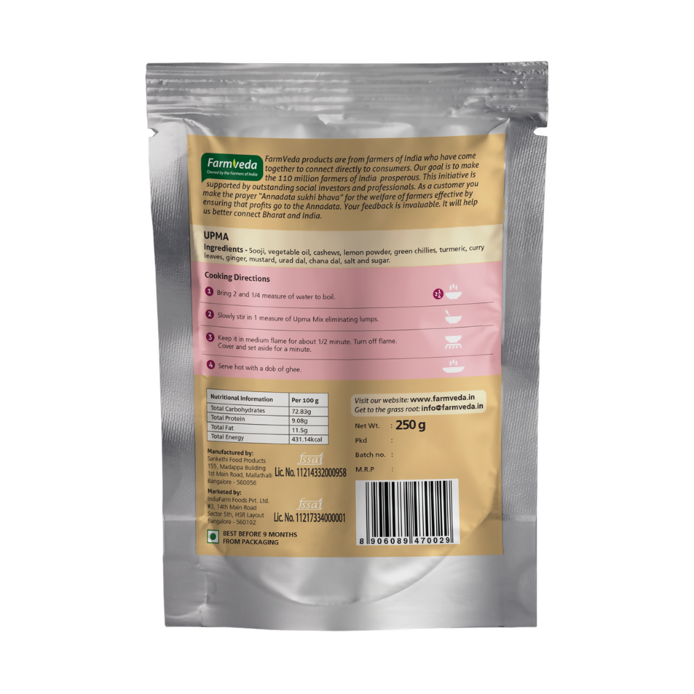 • Farmveda Upma Mix brings to you this most popular south Indian breakfast item with all its true authentic goodness. Tasty and flavorsome upma ready in just minutes. Serve this with Farmveda Chutney Podi or Farmveda Groundnut Chutney Podi. The farmers who own Farmveda ensure that the best quality food reaches your table.