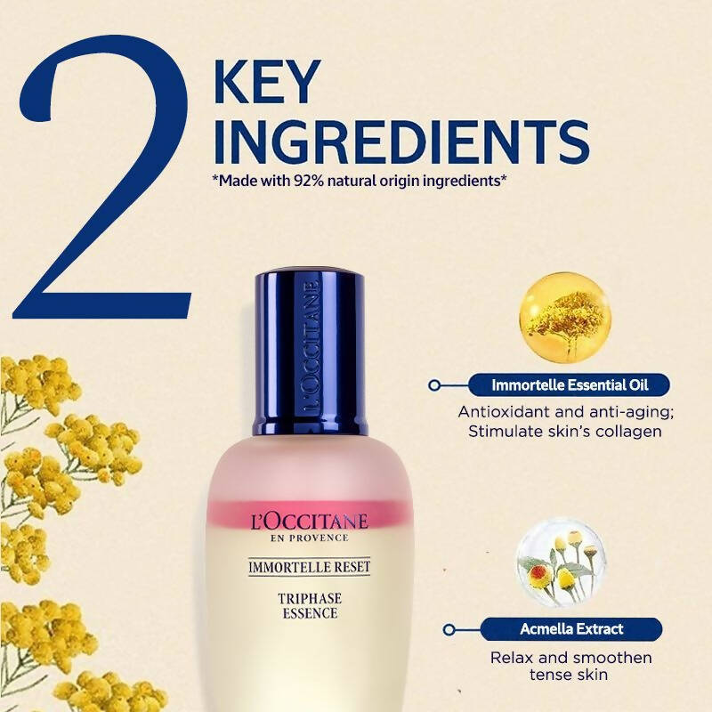 L'Occitane Immortelle Reset Triphase EssencePower up your skin microbiome, your skin’s 1st layer of defence, with the Reset Tri-phase Essence for r...