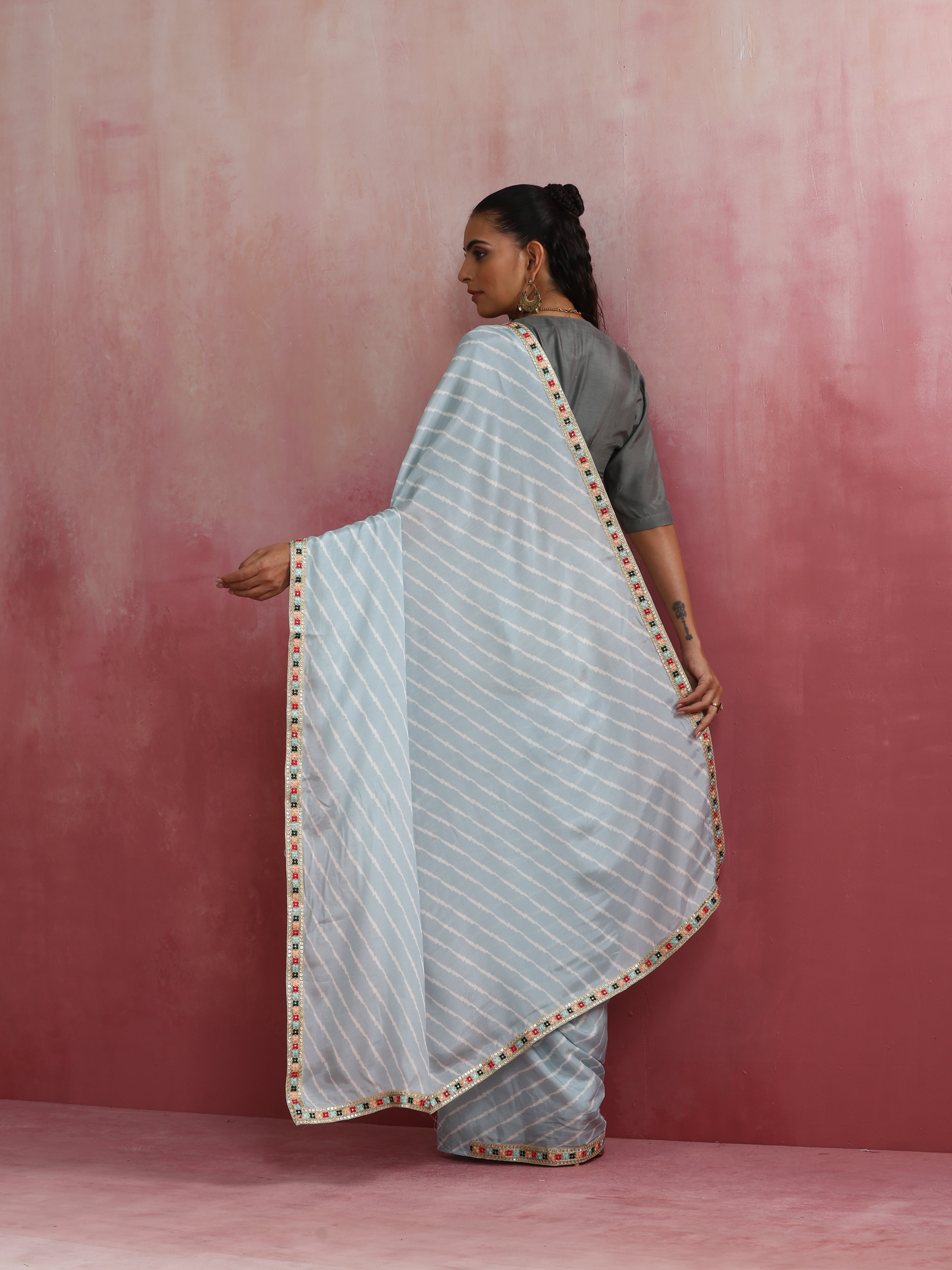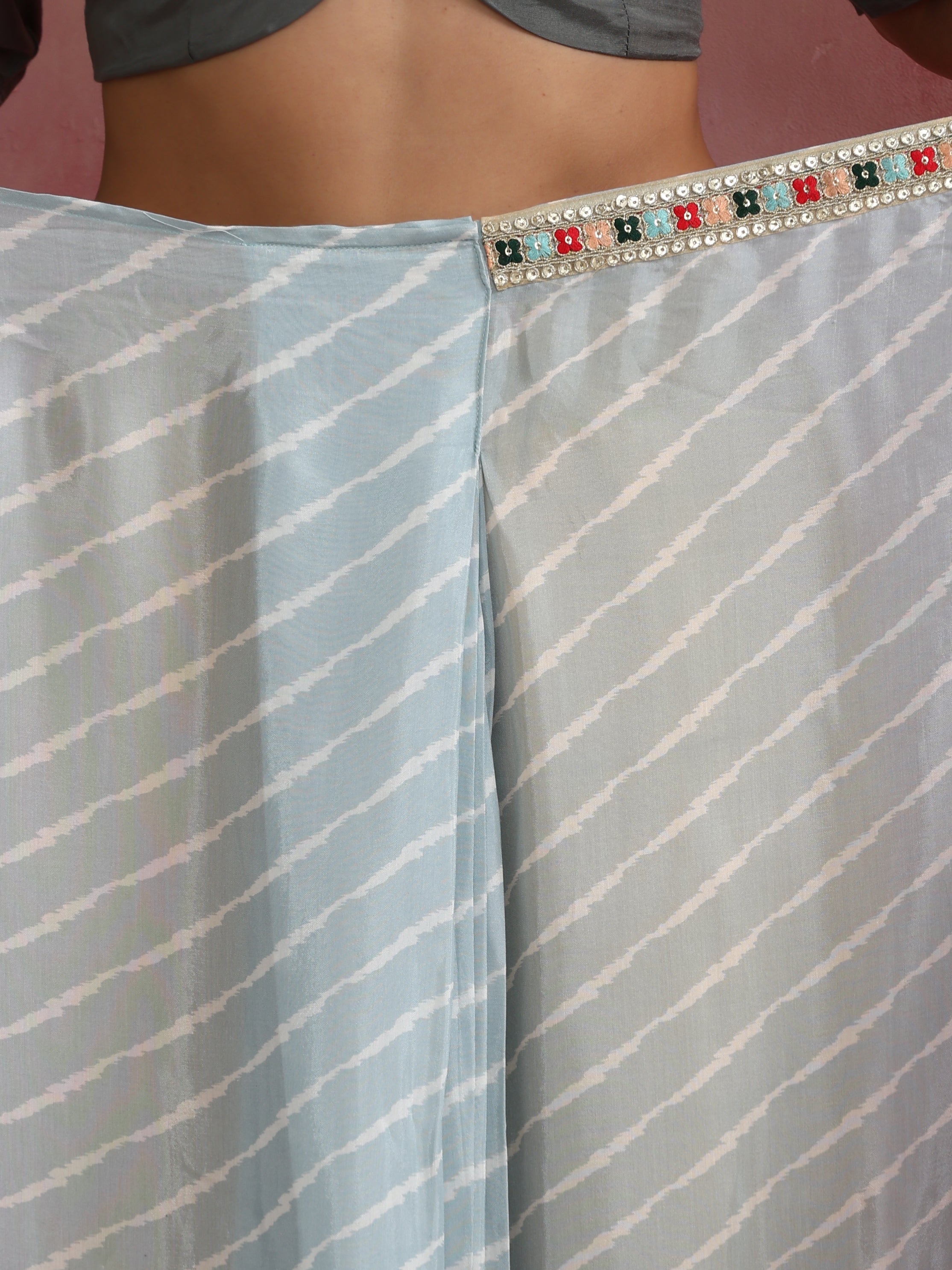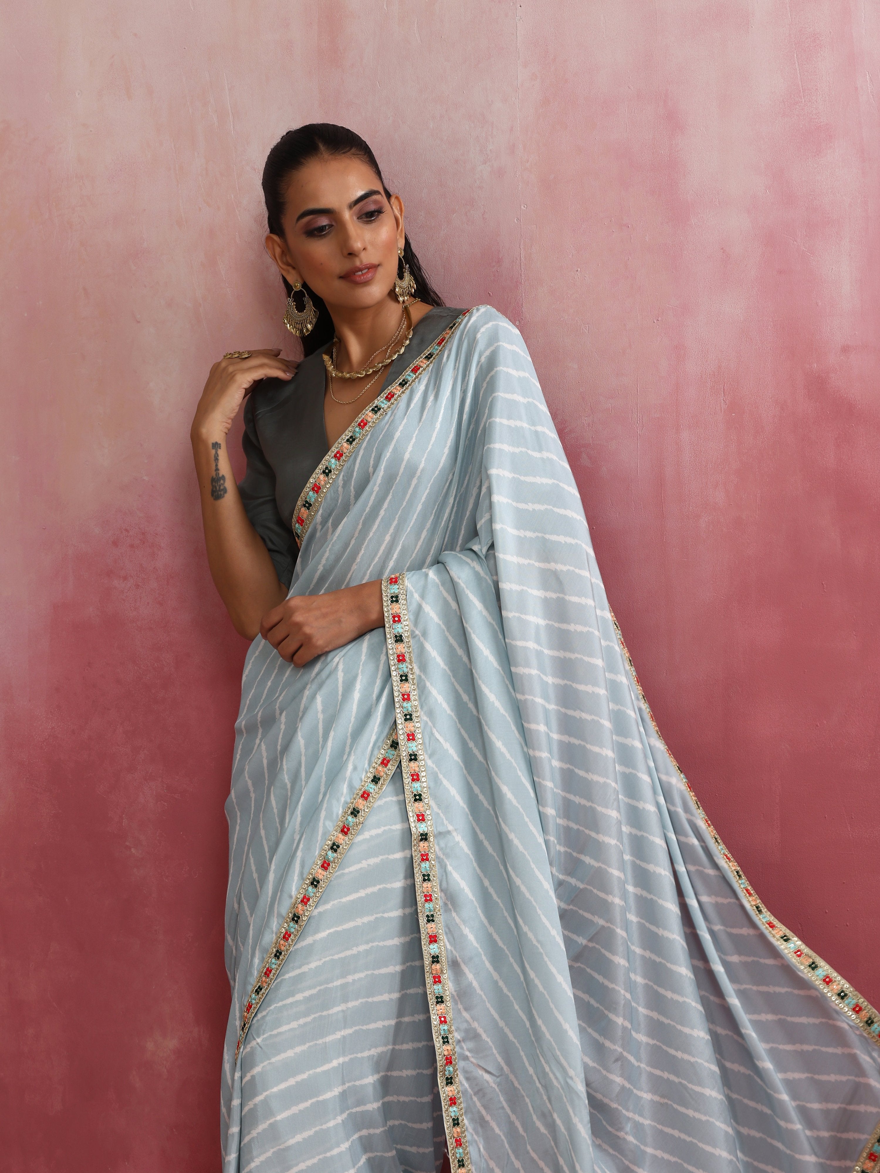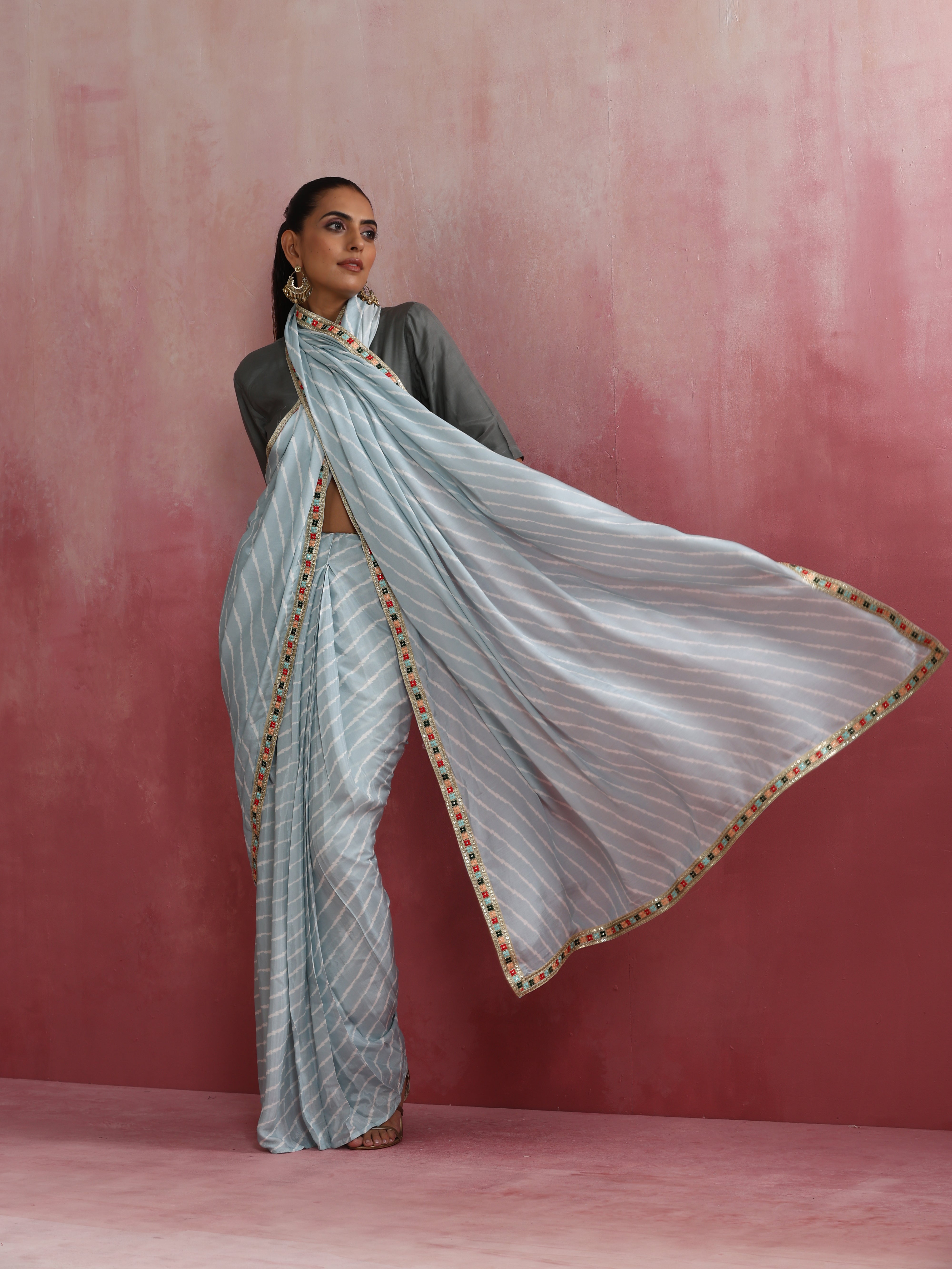 • Elevate your style with this grey leheriya print muslin silk saree. It's an ideal blend of elegance and comfort.