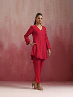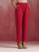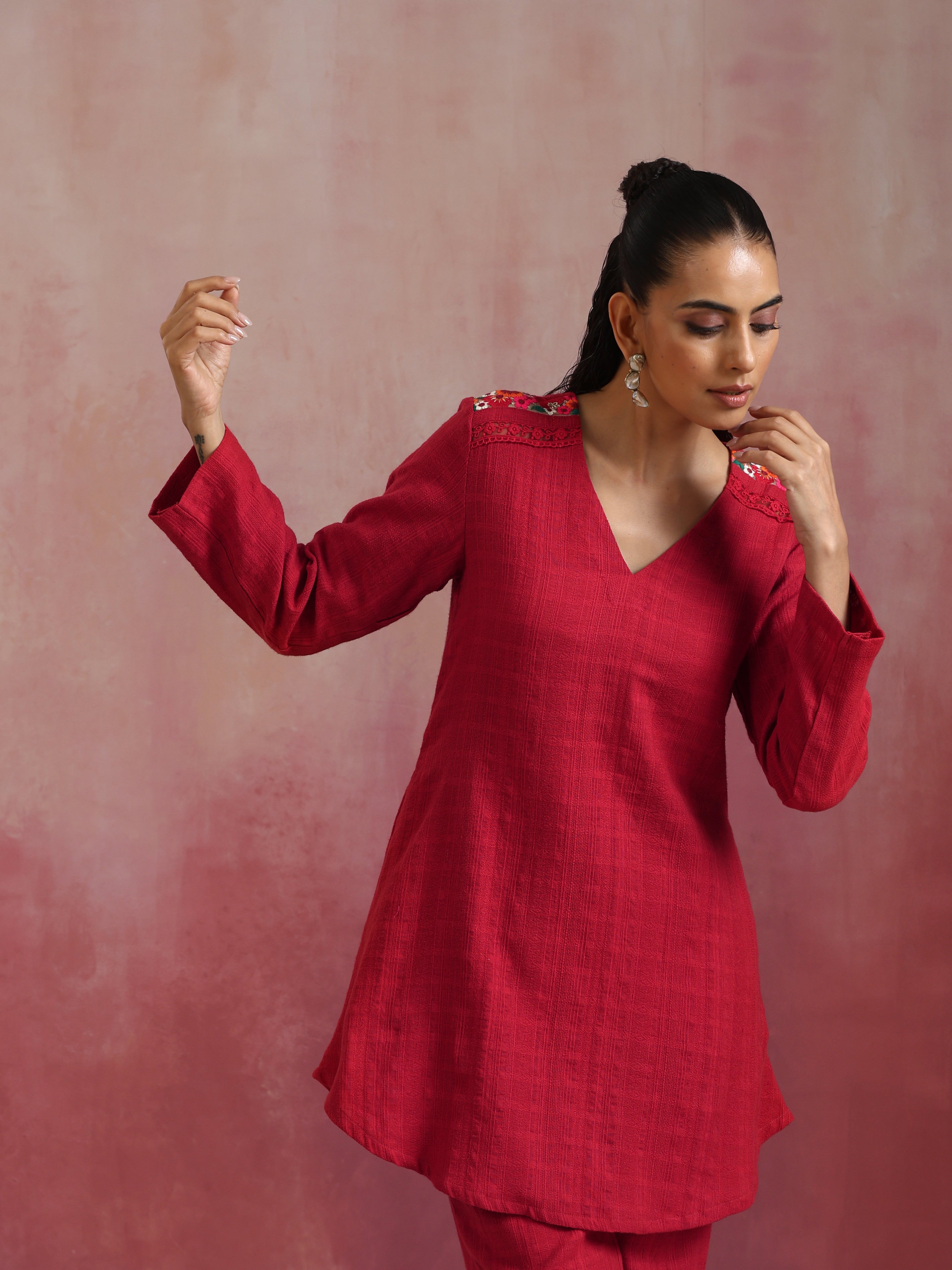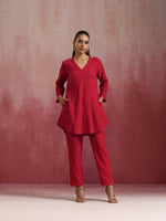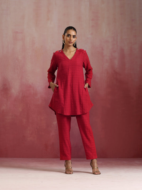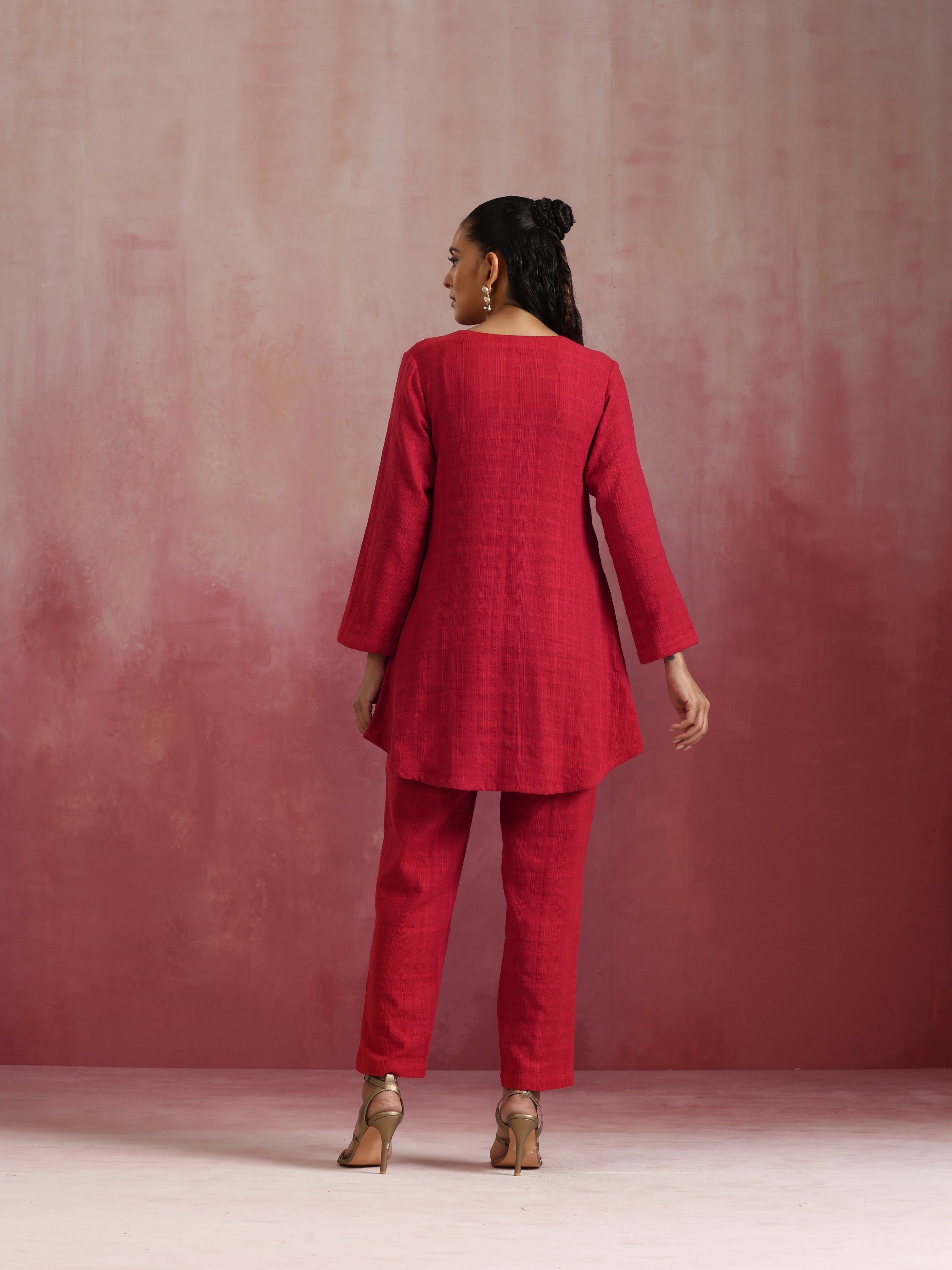 trueBrowns Red Cotton Dobby Kurta Co-ord set - XS