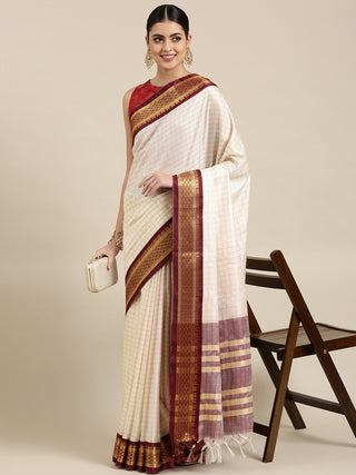Kalini White & Maroon Checked Zari Silk Cotton Saree