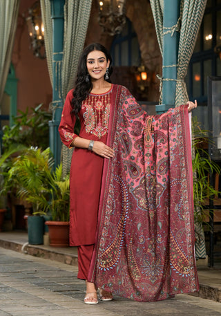 Juniper Women's Brown Thread Embroidered Liva Rayon Kurta Pant And Dupatta Set With Sequins