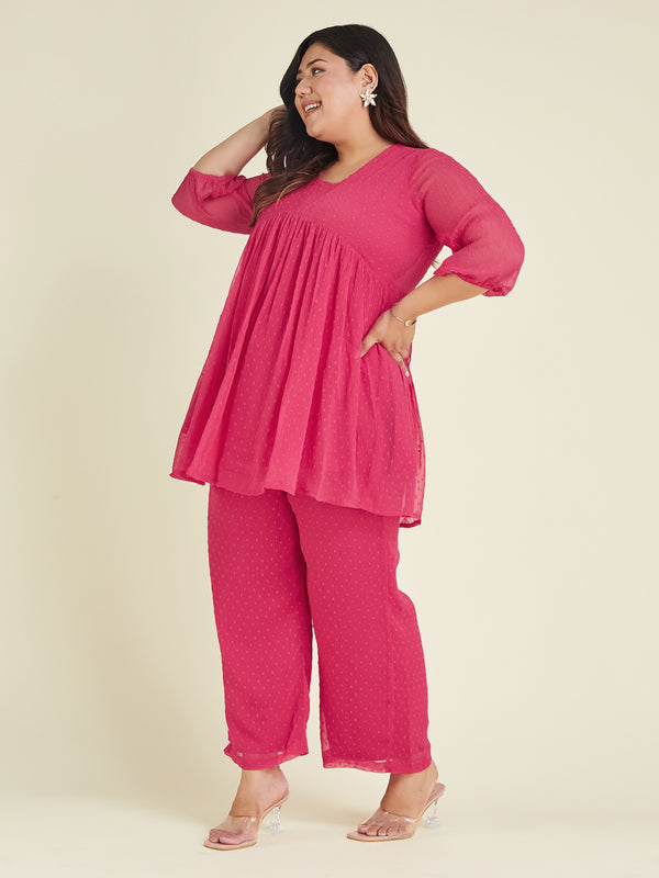 Janasya Bright Dobby Chiffon Self Design A-Line Top & Bottom Set - 3XL