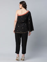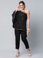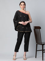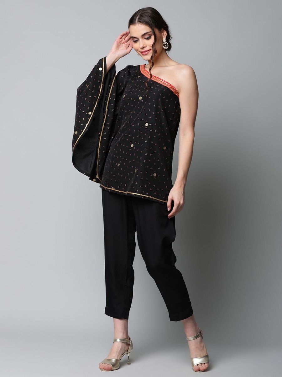 "This is Black Kurti made from Crepe fabric having khadi and Gold foil print work, Straight shape, Regular style, One shoulder, sleeveless, Above knee length with curved hem.