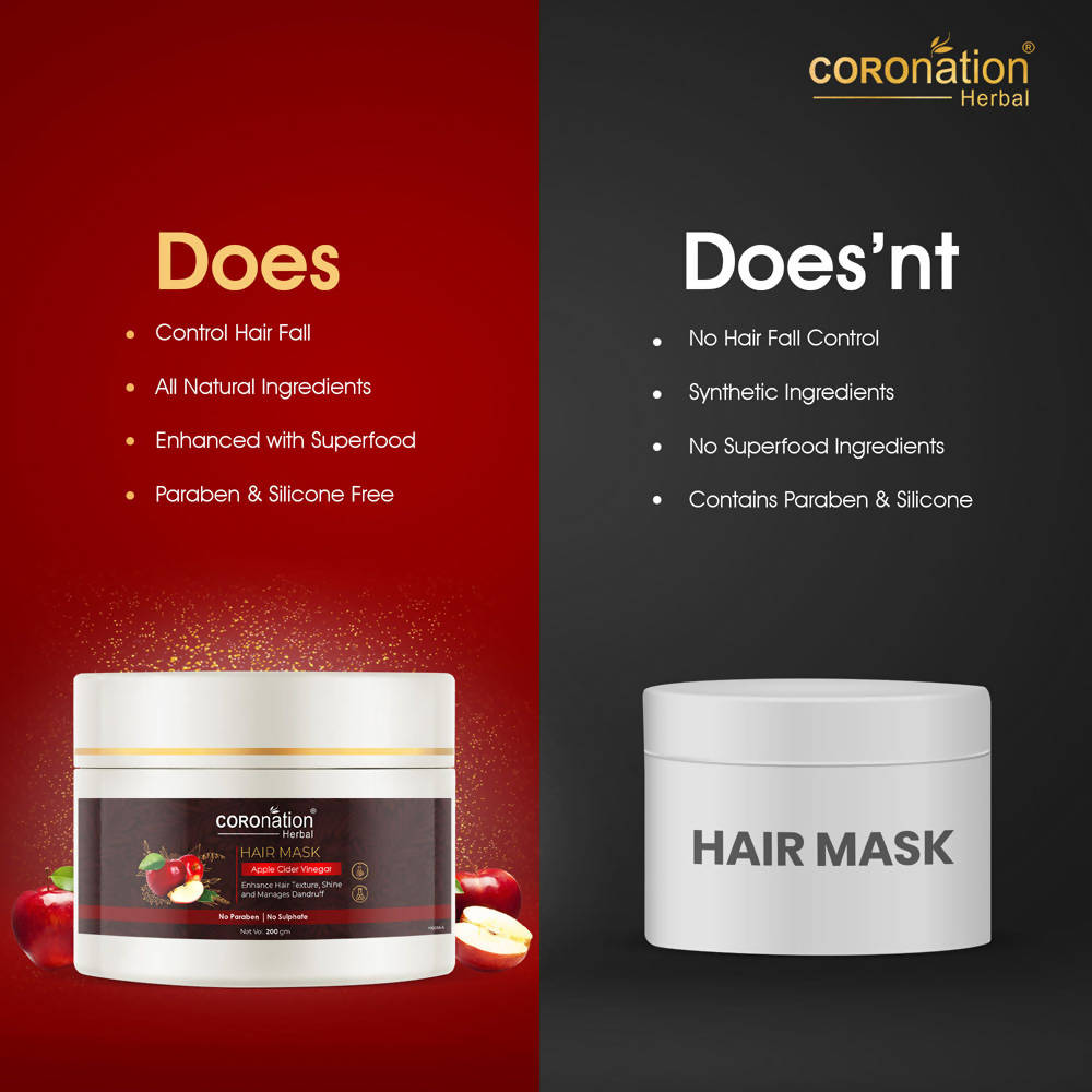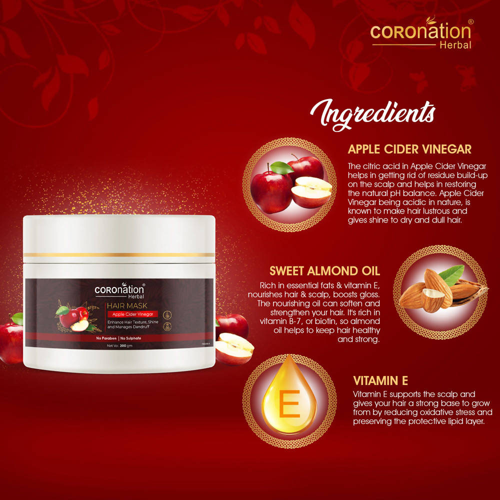 COROnation Herbal Apple Cider Vinegar Hair Mask, This hair mask has a blend of natural ingredients of Apple Cider that aids in enhancing your hair texture, shine & managing dandruff. It also helps to fortify damaged hair shafts & reduce greasiness from the strands.