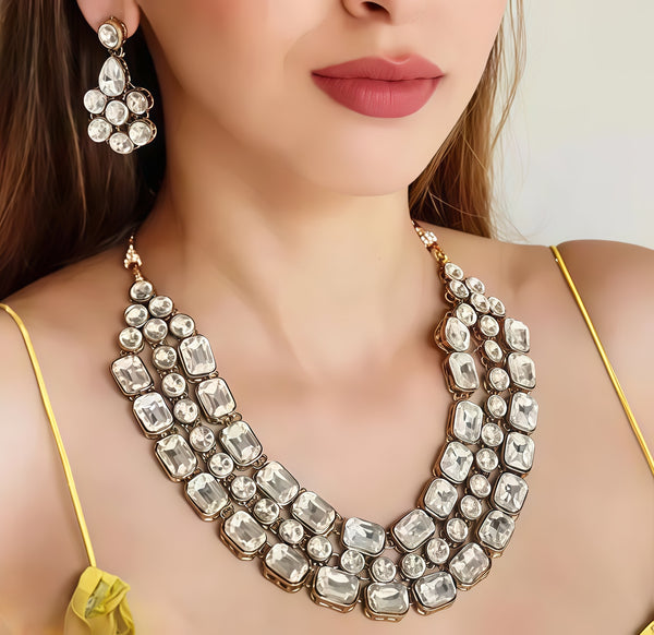 Turn heads at every occasion with this glamorous modern kundan-style necklace set, crafted with premium quality clear stones set in a stunning gold-plated base. The set features a bold, three-layer necklace and matching dangle earrings, perfect for adding a touch of luxe to any outfit.