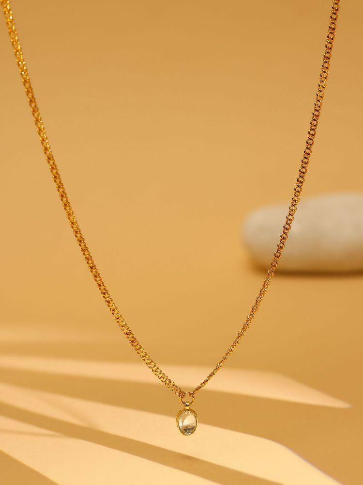 Ruby Raang’s minimalist Kundan gold necklace offers understated elegance with a modern twist. Handcrafted by marginalized women artisans, this delicate piece features a sleek gold-plated chain adorned with a single, finely cut Kundan stone that catches the light subtly. Crafted sustainably using eco-conscious methods, it’s perfect for everyday wear or layering with other jewelry for a chic, refined look. This necklace embodies simplicity, ethical craftsmanship, and timeless style—ideal for those who appreciate subtle luxury with a meaningful story.Styling Tip:Wear it alone with a crisp white shirt or a simple dress for effortless elegance, or layer it with other delicate gold chains to create a trendy, personalized look.
