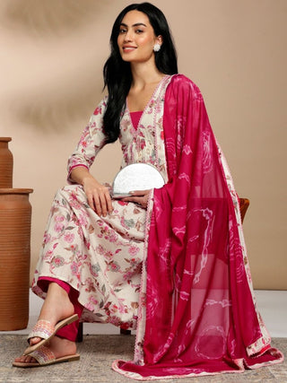 Anouk Cream Floral Printed V-Neck Pure Cotton Anarkali Kurta with Trousers & Dupatta