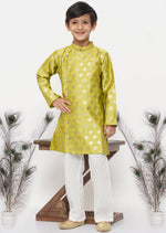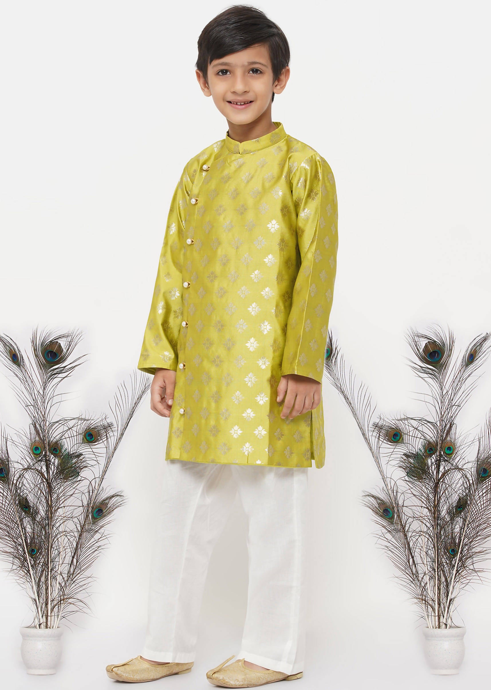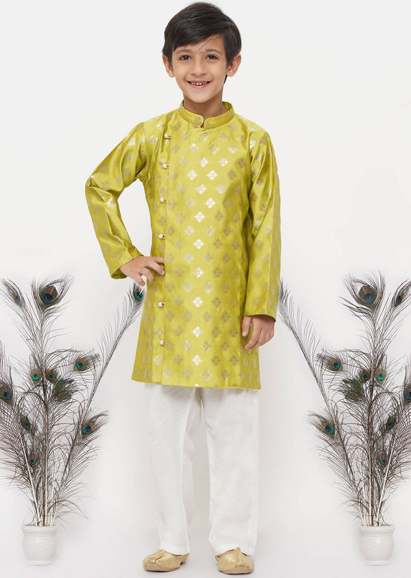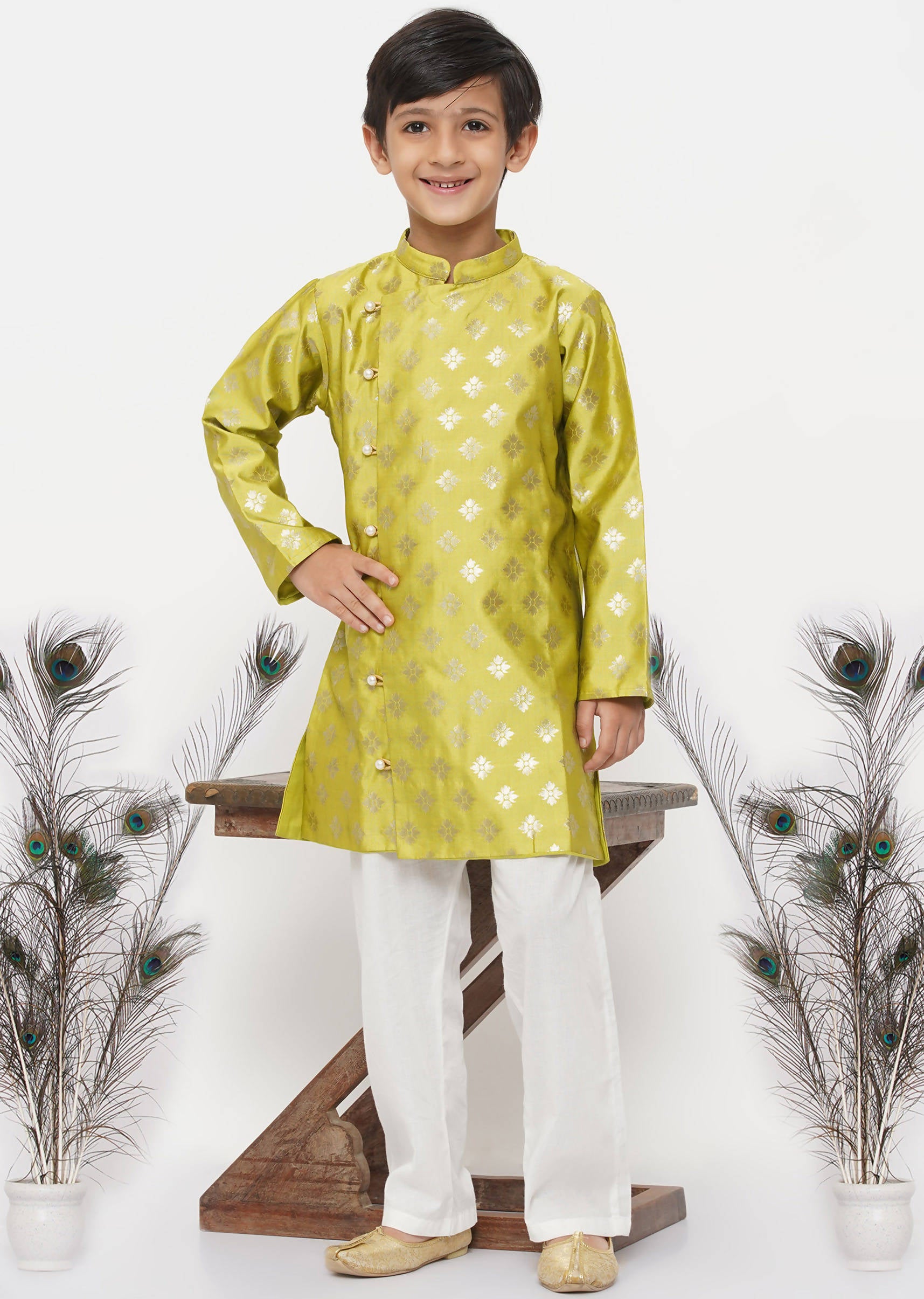 Little Bansi Banarsi Silk Sherwani & Pyjama - Apple Green & Cream Color: Apple Green and Cream Material Info/Upper Fabric: Silk Silhoue...