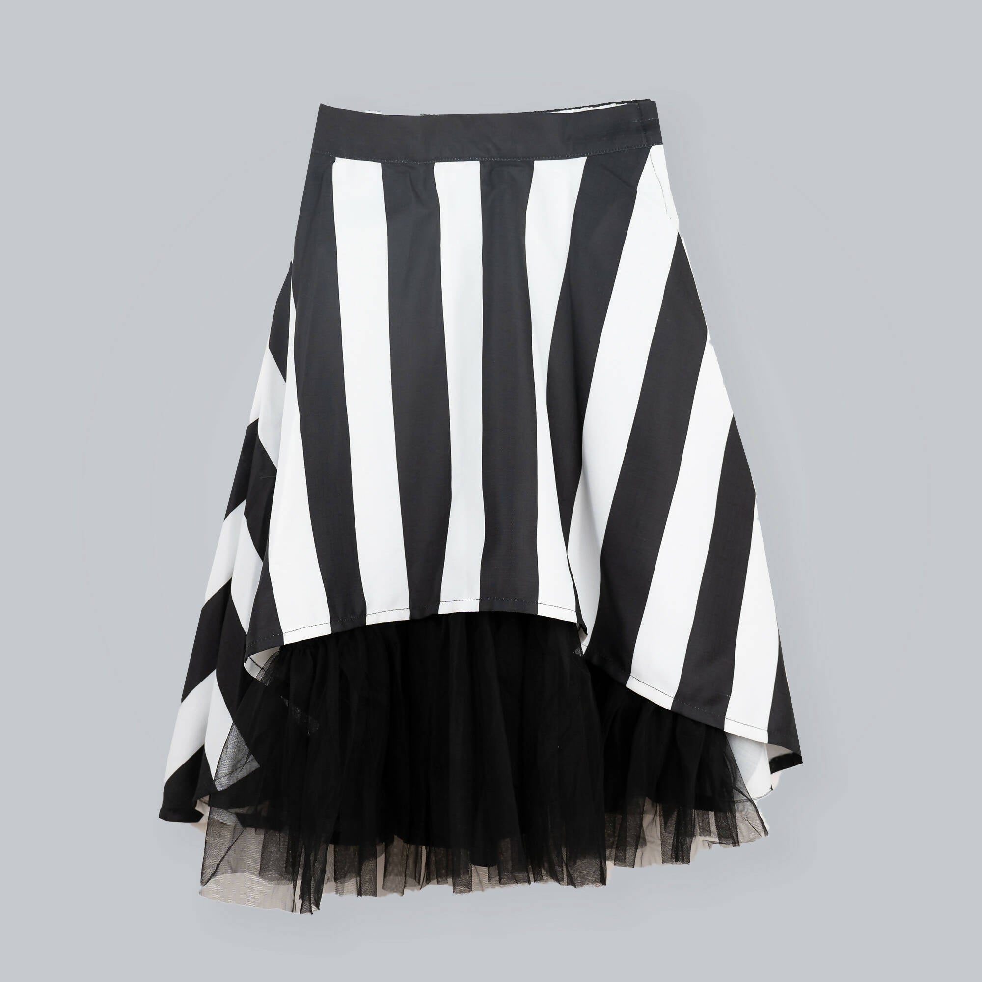 Flower print choli with purple and maroon net frill above the chest and black and white strip ghagra with black net frill inside which is visible in front of the garment and flower print dupatta with purple, maroon, black net frills at borders of dupatta