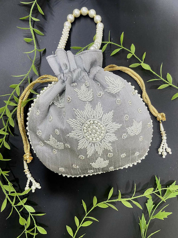 Joban Fashion Pearl Hand Work Potli Bag - Grey