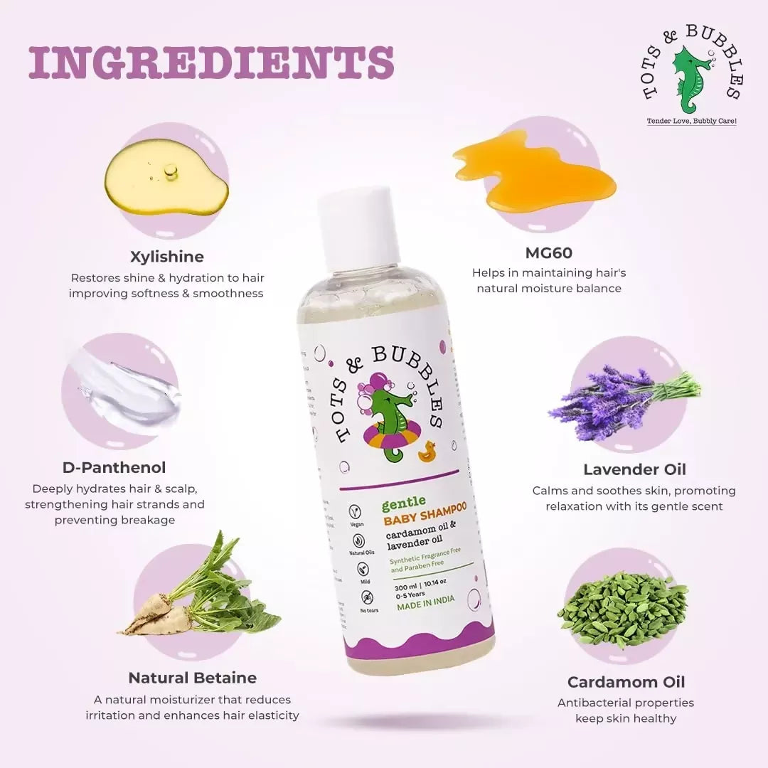 Tots & Bubbles Gentle Tear Free Shampoo with Natural Lavender & Cardamom Oil About the Product:Dispense a coin sized amount on to your palm...