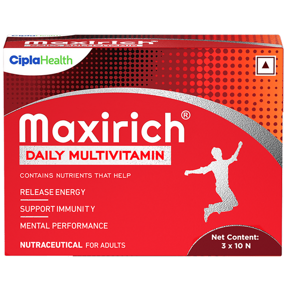 Cipla Maxirich Daily Multivitamin Softgel For Energy Immunity & PerformanceHow to use:Take one capsule daily after a meal. As suggested by Expe...