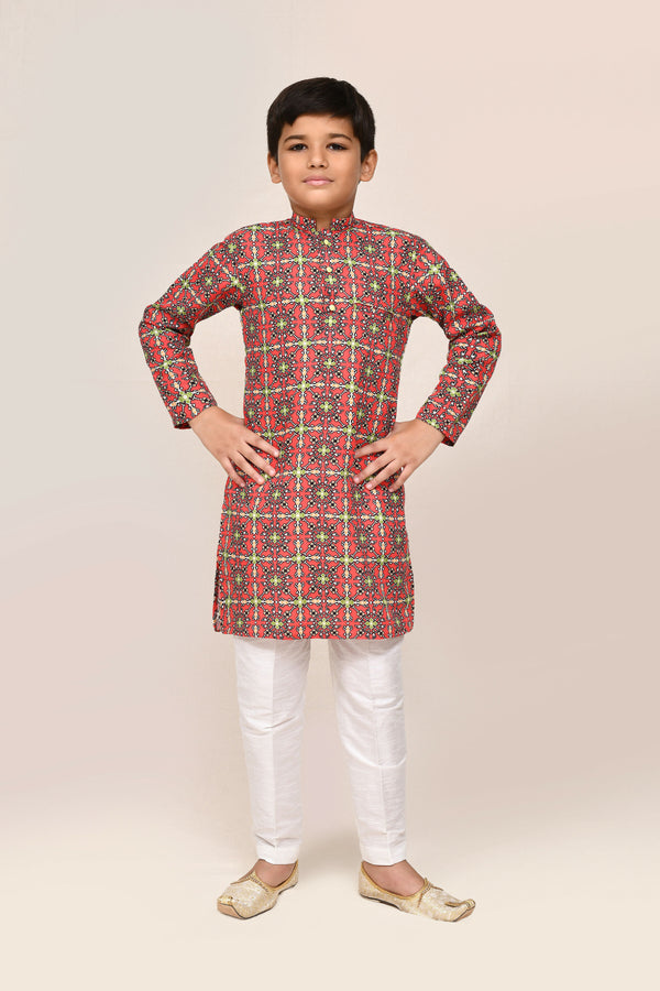 Joban Fashion Cotton Red Kurta With Straight Fit Pant - 1Y-2Y