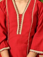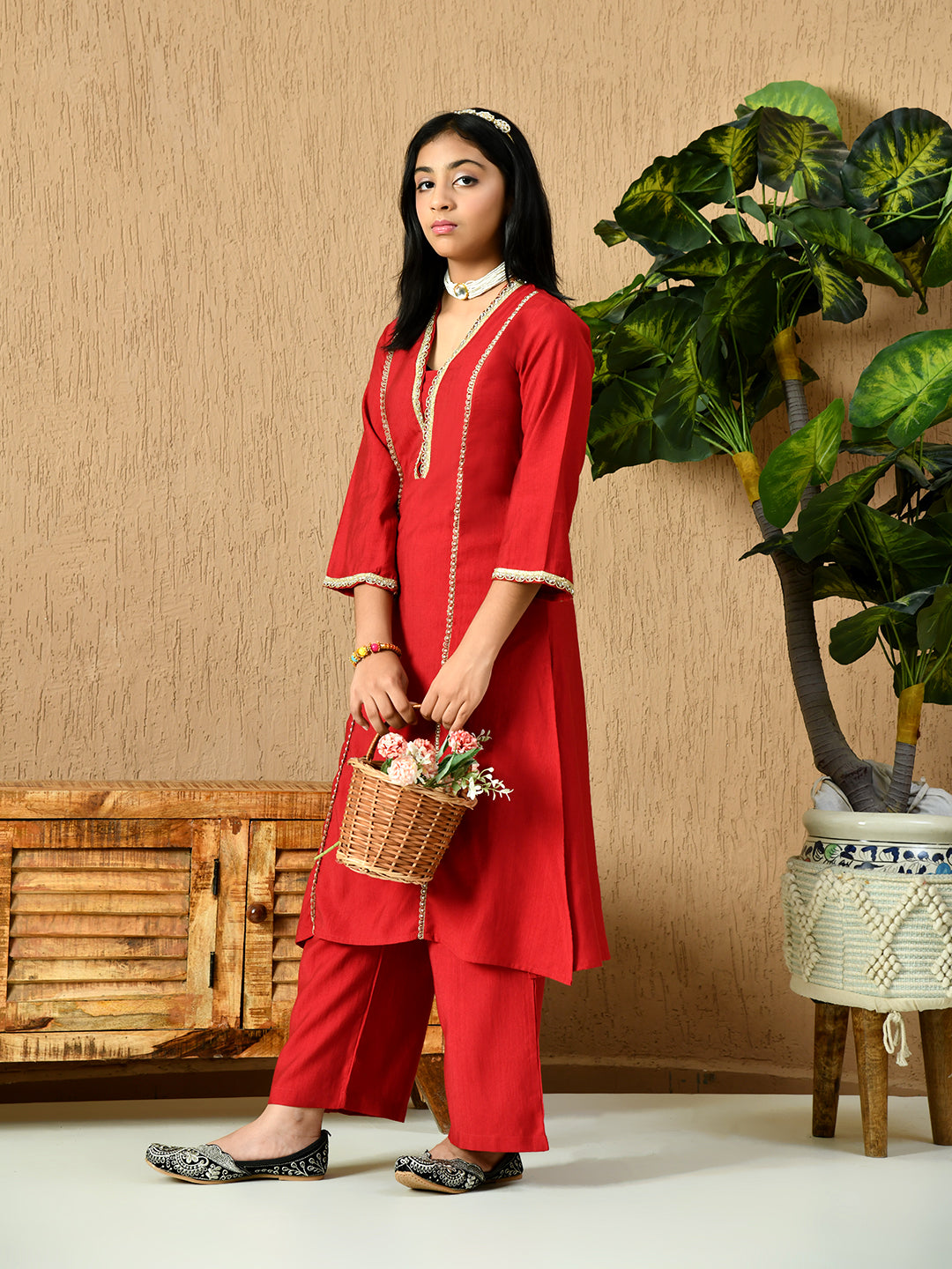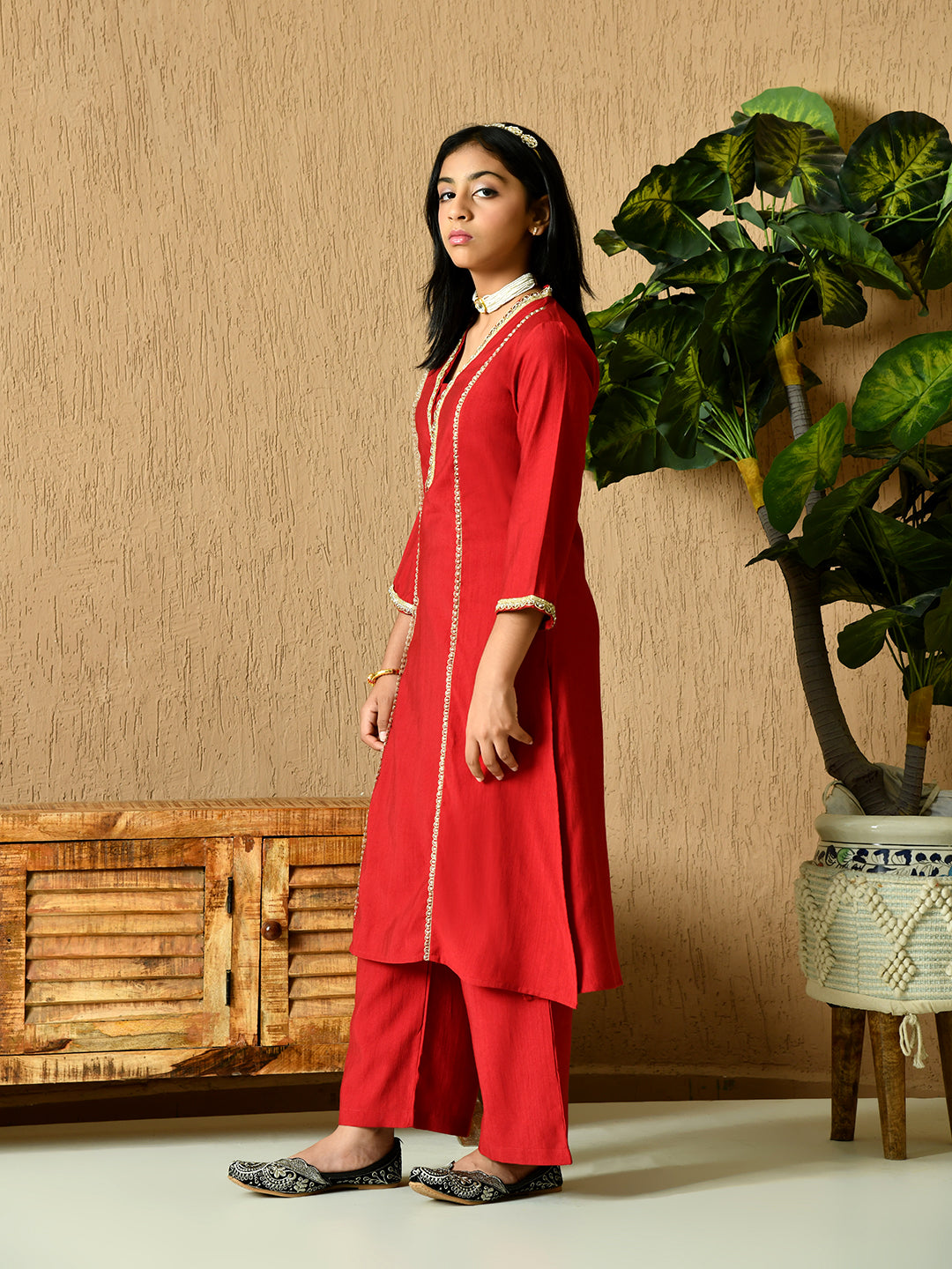 Myshka Kids Girls Calf length Embellished Kurta Set Red Color Pack Contains: Package-1 Kurta, 1 Trouser Shape: A-Line Fabric: Silk Color: Red ...