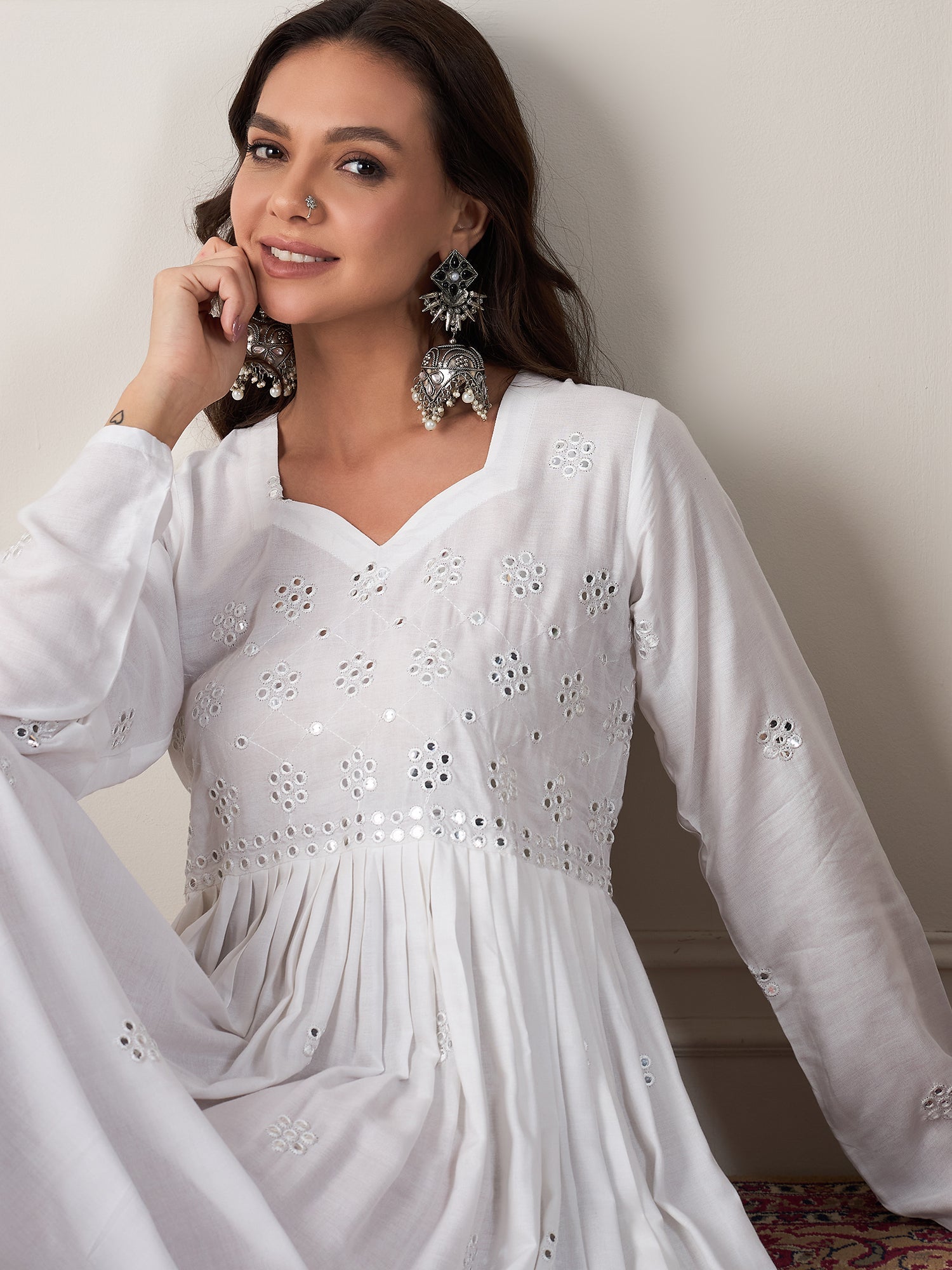 InWeave White Mirror Work Long Anarkali Kurta