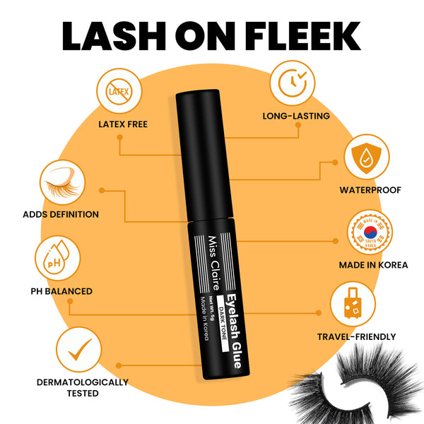 Bat your falsies effortlessly with long lasting hold using Miss Claire's Eyelash Glue. first. This gentle eyelash adhesive is non-toxic and pH-balanced for safe use. Its dark pigment blends in with your natural eyelashes seamlessly, making the long lasting bond look real.
