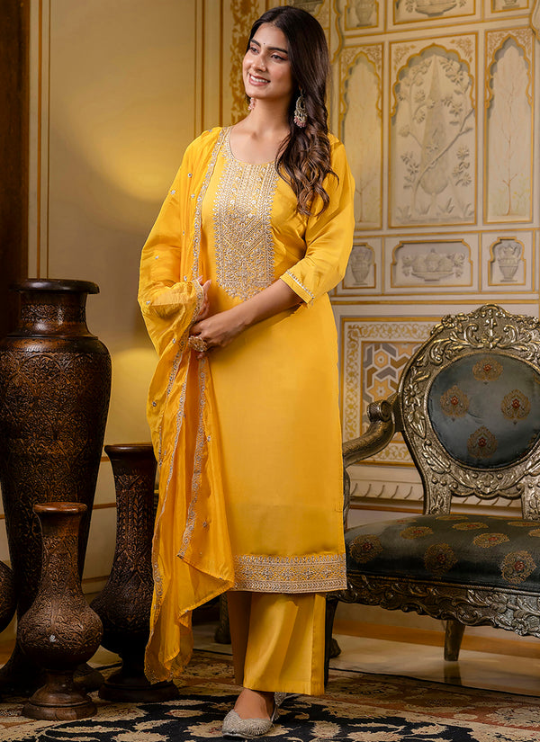 Bright and radiant, this Yellow Silk Blend Salwar Suit adds charm to everyday festive dressing. Embroidery accents uplift its traditional vibe, making it a great choice for casual pujas and gatherings.