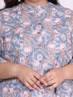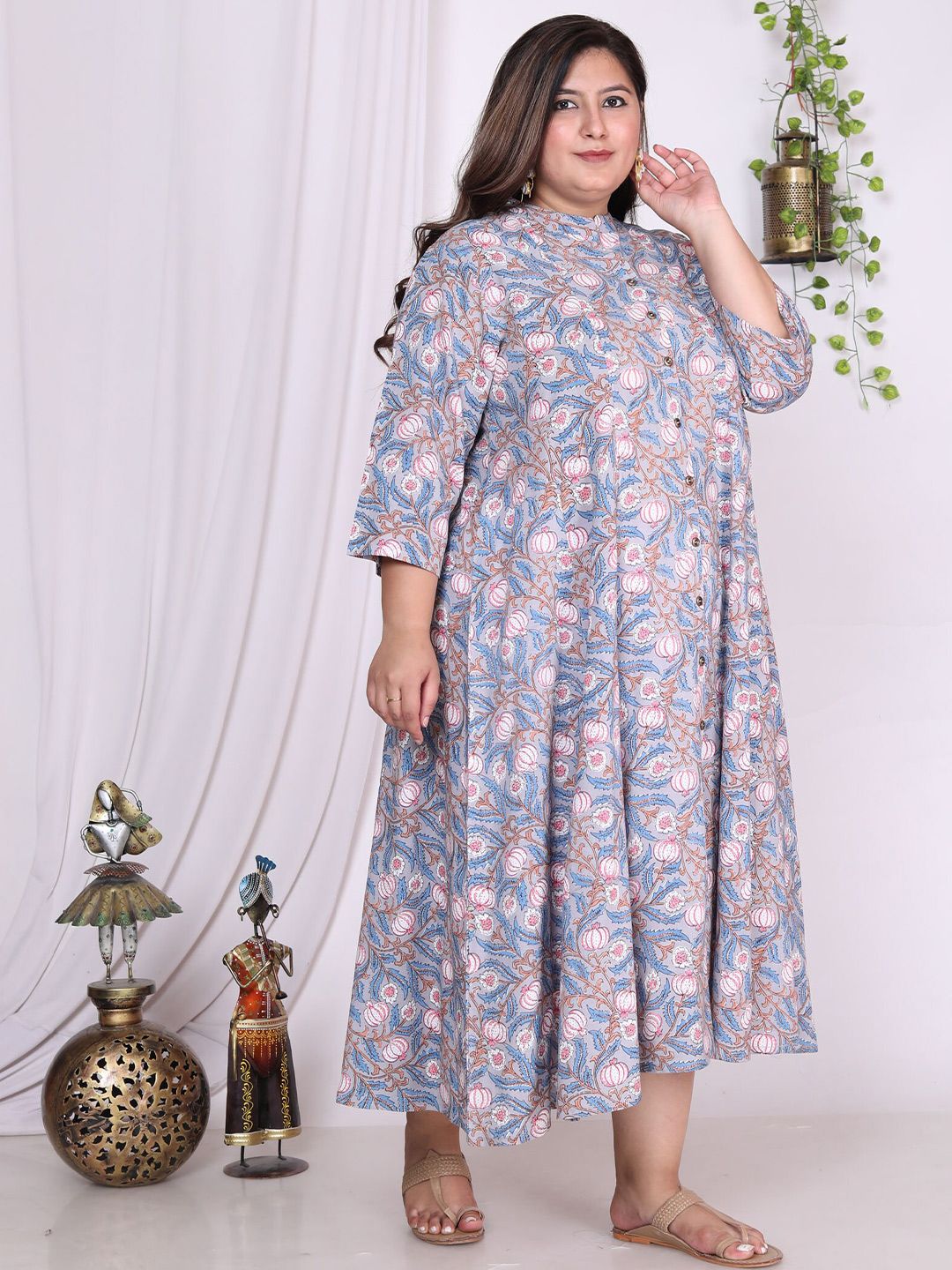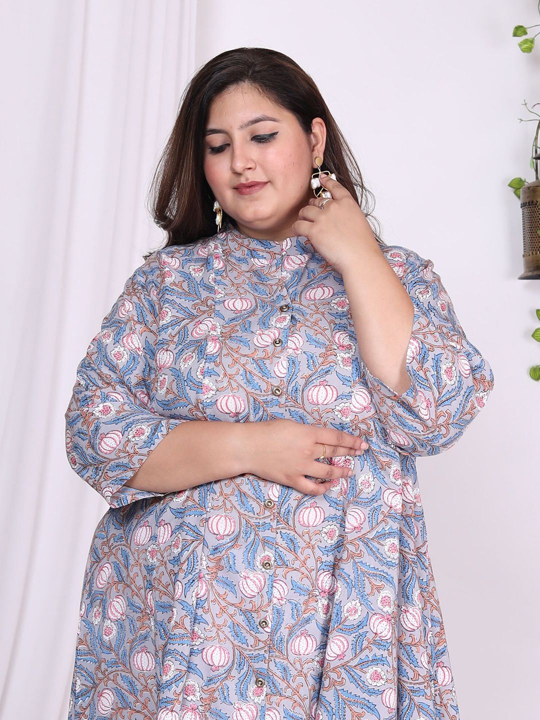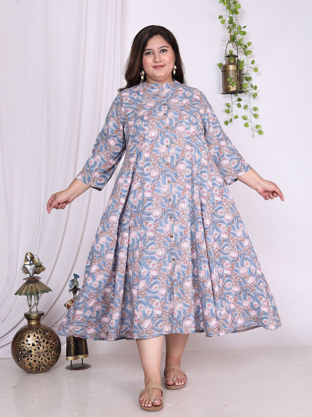 Swasti Plus Size Floral Printed Mandarin Collar Cotton A-Line Midi Ethnic Dress Product Details Grey, blue & white A-line ethnic dress Flo...