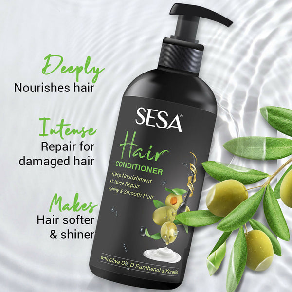 • Sesa Hair Conditioner contains the power of Olive oil & D Panthenol to provide deep nourishment & Intense repair. Expert care that reaches hair’s cellular level - with Olive oil's moisturizing and Keratin's damage repair properties. Sesa Hair Conditioner provides Intense repair for damaged hair. D panthenol improves hair shine & softness. Provides free-flowing, shiny hair, Hair appears bouncy and more manageable. Take a small amount of conditioner into the palm of your hand, apply the product to the ends of your hair only, distribute the product evenly, allow the conditioner to absorb, and rinse thoroughly.