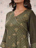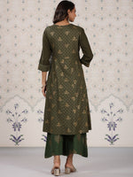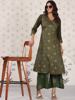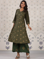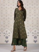 Ode by House of Pataudi Olive Green & Gold Printed V Neck Angrakha Kurta With Palazzos - M