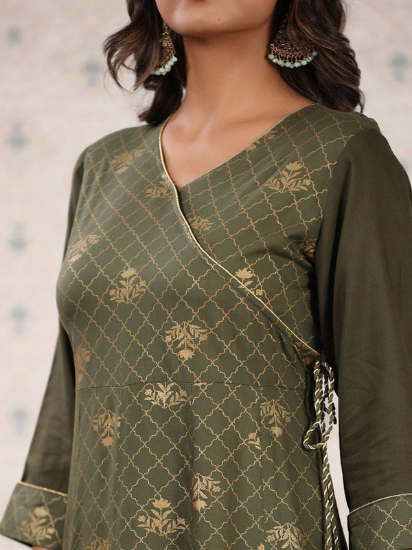 Ode by House of Pataudi Olive Green & Gold Printed V Neck Angrakha Kurta With Palazzos - Distacart