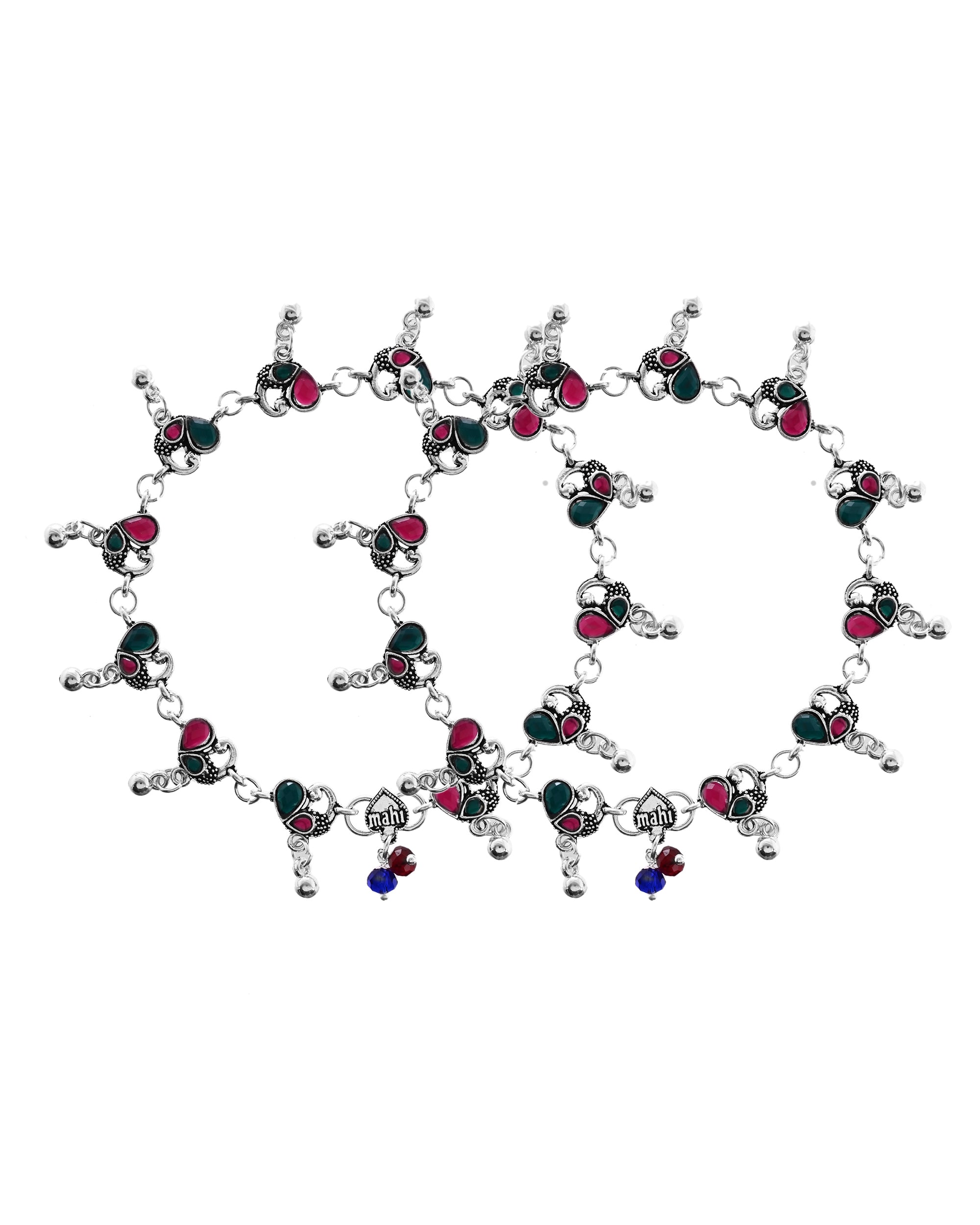 Set of 2 silver-plated peacock-shaped stone-studded anklets, crafted with intricate detailing and sparkling stones. Featuring elegant peacock motifs, these anklets add a traditional and stylish touch to any outfit. Lightweight, durable, and versatile, they are perfect for festive occasions, casual wear, or gifting, making them a beautiful addition to your jewelry collection.Legal Disclaimer :Product color may slightly vary due to photographic lighting sources or your monitor settings.