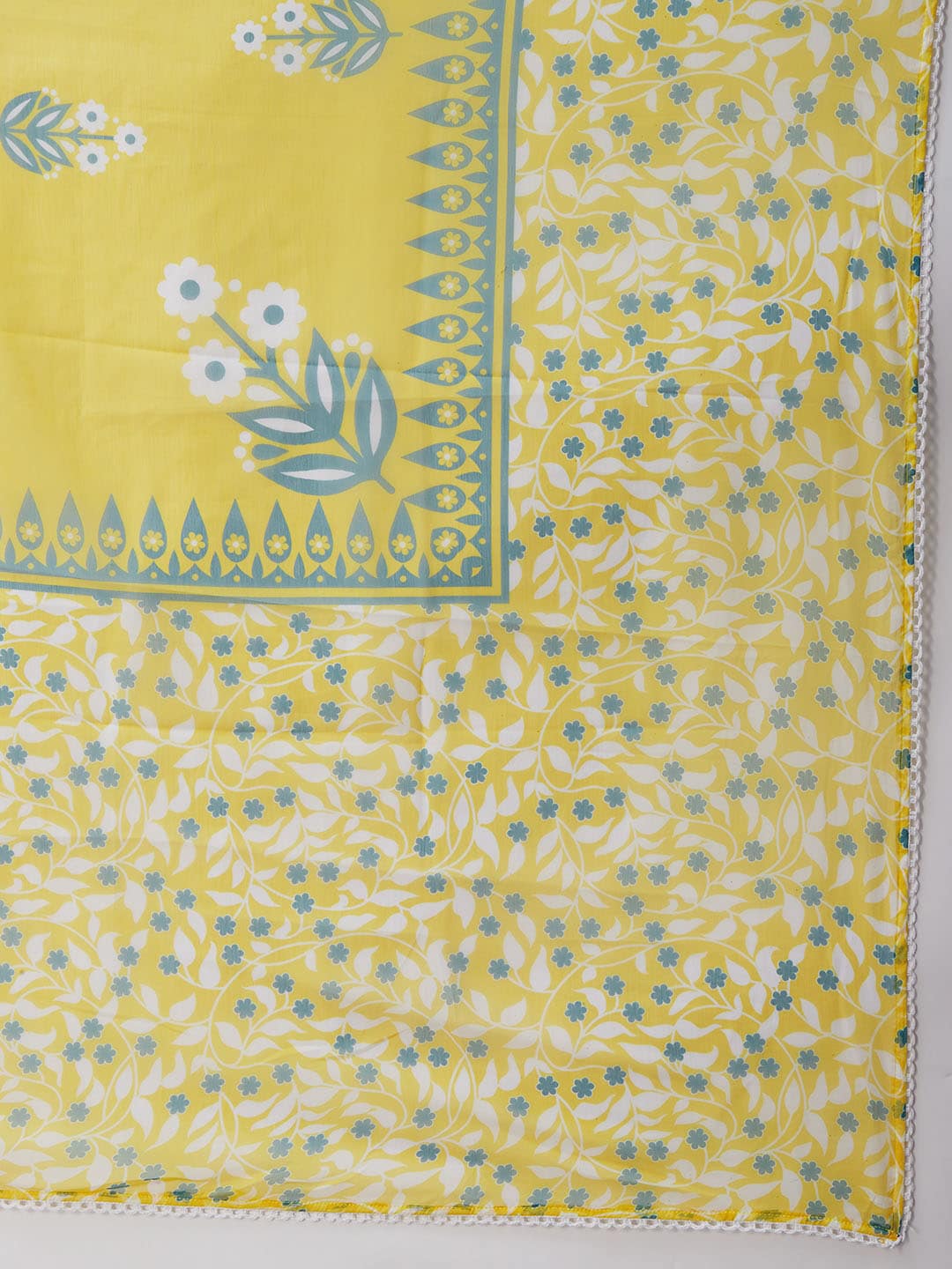 Yellow, blue, and white printed kurta with trousers and dupatta