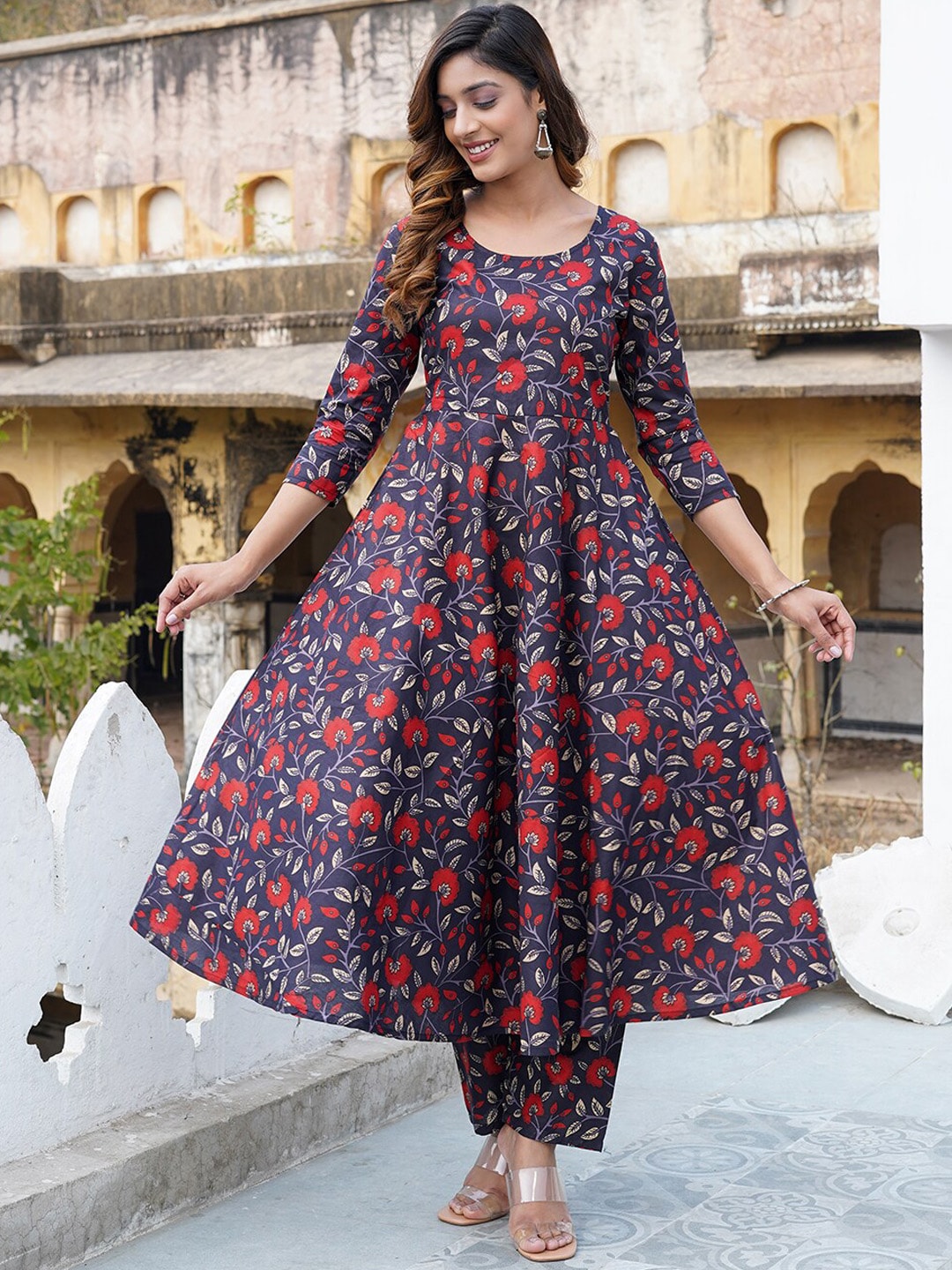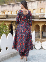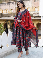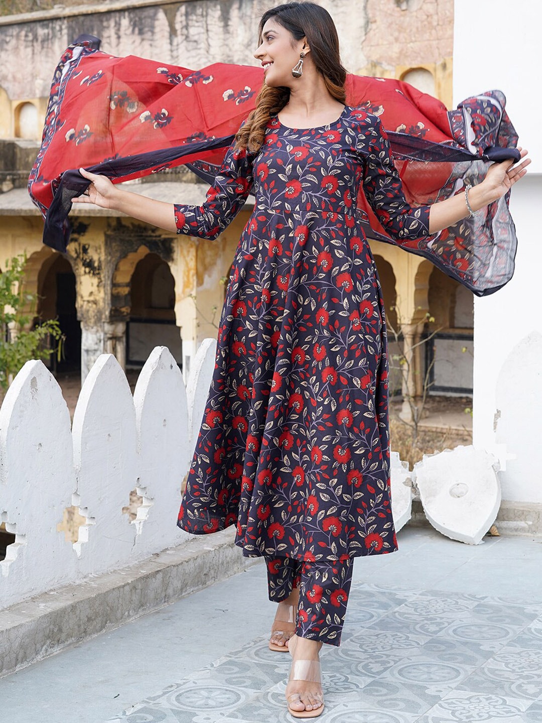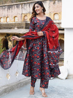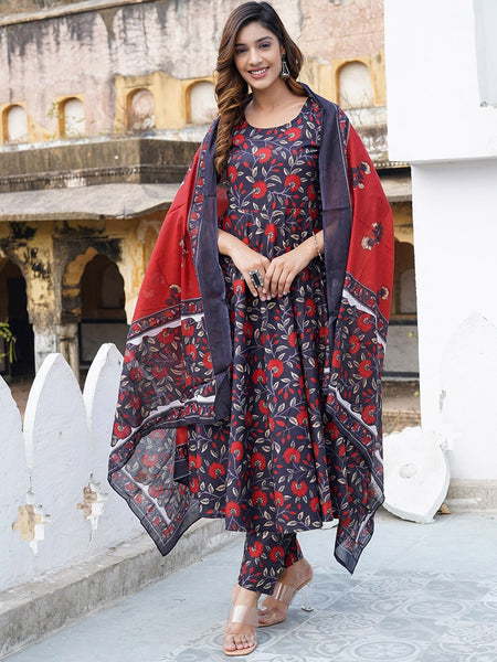 Kalini Floral Printed Anarkali Pure Cotton Kurta with Trousers & Dupatta Product Details Navy blue, red and off white printed Kurta with Tro...