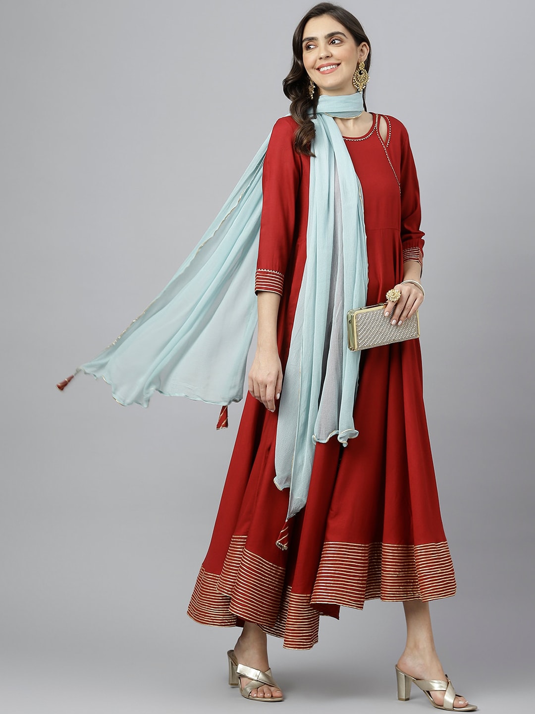Kalini Women Maroon Solid Anarkali Kurta With Dupatta Product Details Consists of kurta and dupatta Kurta Colour: maroon Dupatta colour: Blue S...