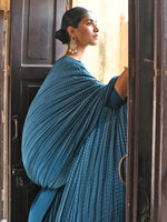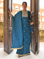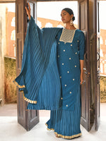 Bring your style game to perfection with this teal blue chinon embroidered kurta with skirt and crushed teal blue dupatta by janasya featuring round neck with delicate embroidery on front panel, quarter sleeves, and straight fit. The teal blue crushed style skirt is crafted in shantoon fabric featuring fully elasticated waistband with lace detailing at the hemline. The set is paired with teal blue crushed dupatta crafted in shantoon fabric adorned with lace detailing at the edges.