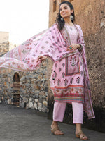 Juniper Women's Lilac Cambric Floral Placement Printed Straight Fit Kurta Sets