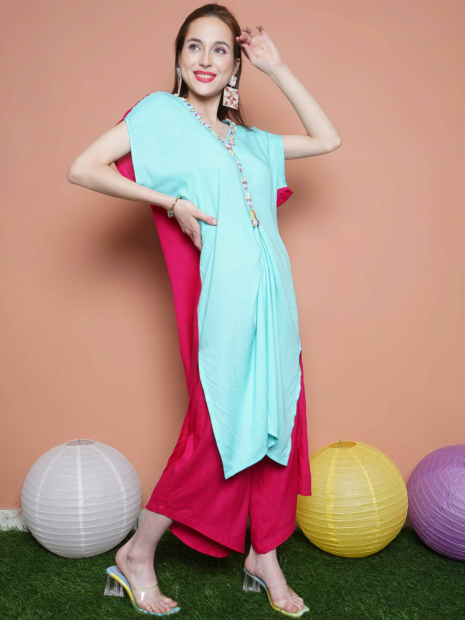 A must have in your wardrobe this summer is this Blue and Pink Hand Embellished kurta set by Women Republic.