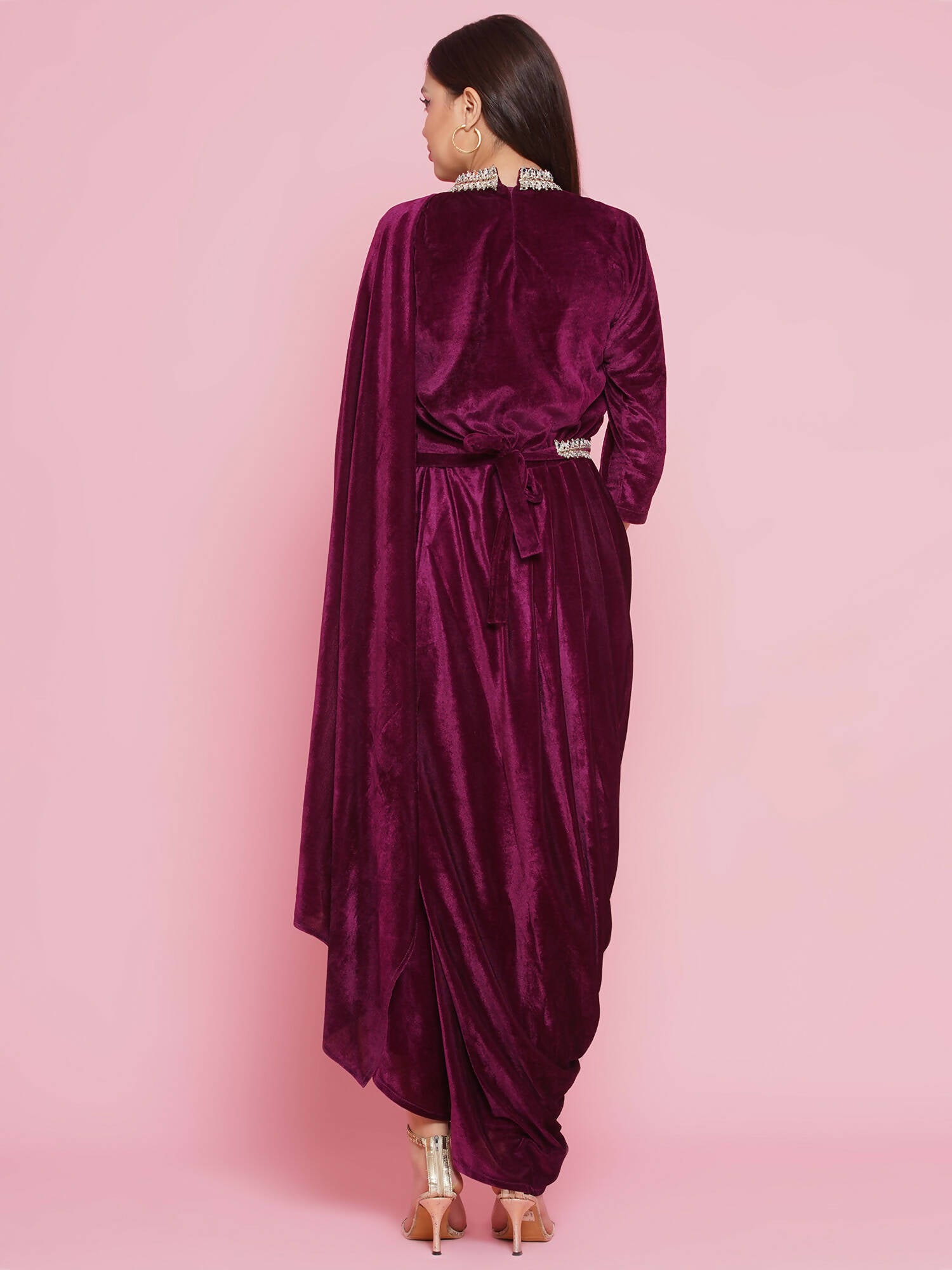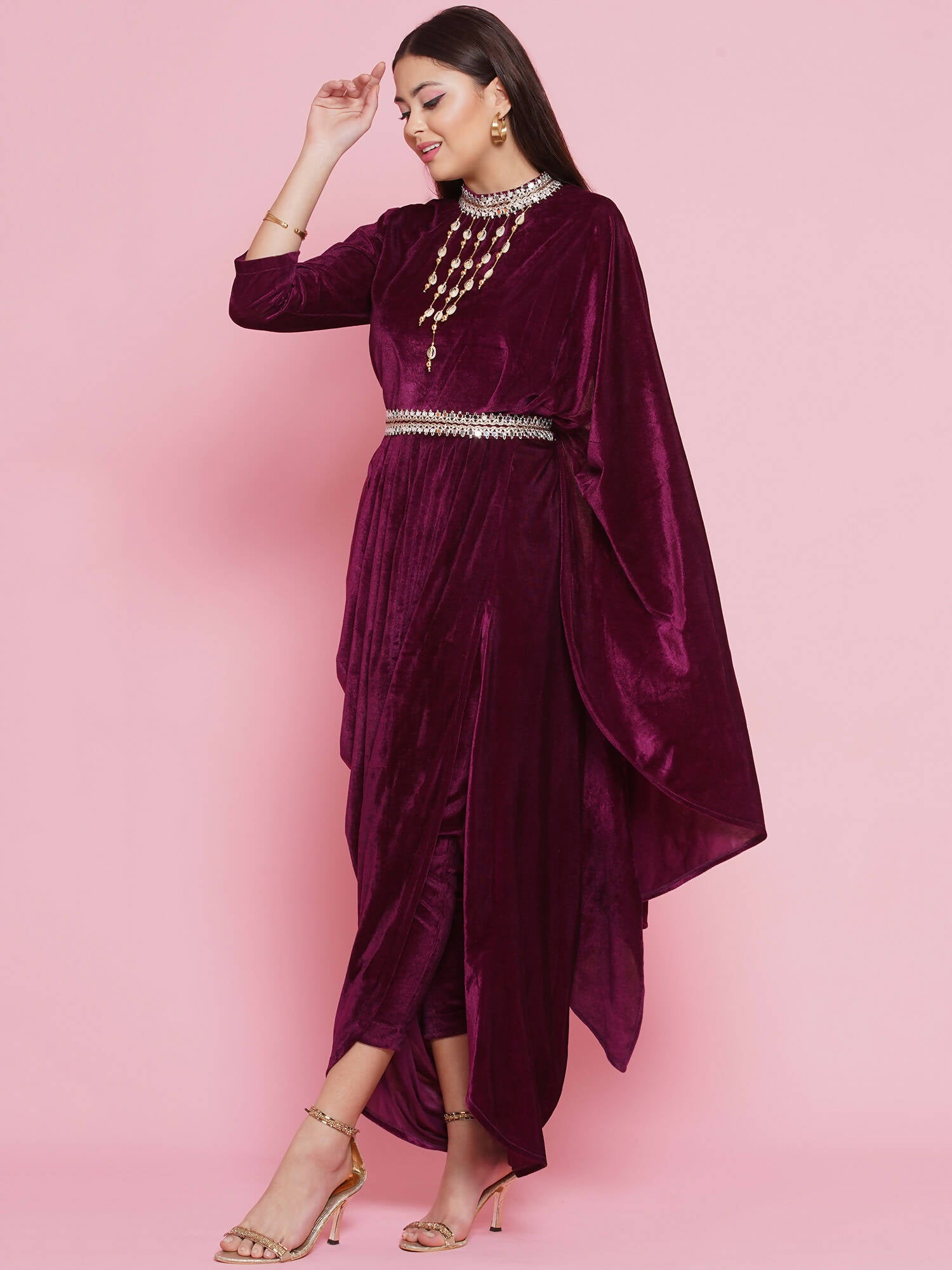 Women Republic Burgundy Velvet Kurta With Attached Neckalace,Belt And Pant - Distacart