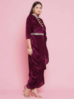Women Republic Burgundy Velvet Kurta With Attached Neckalace,Belt And Pant